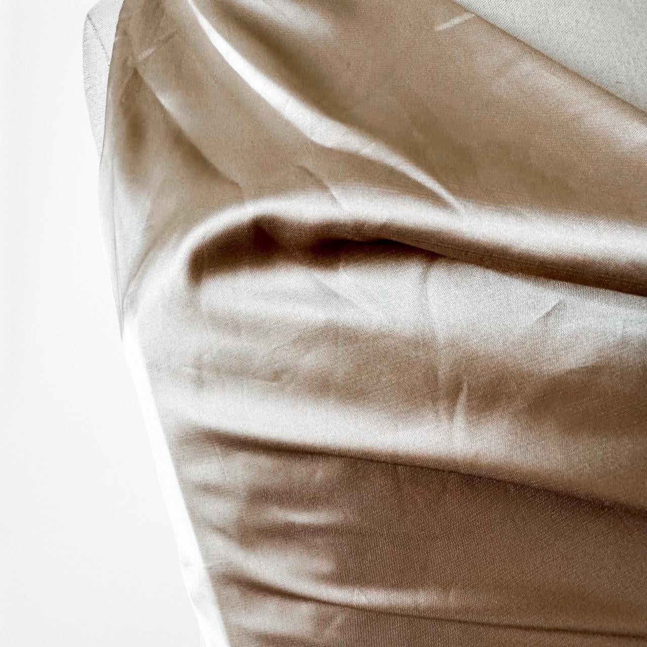 Champagne beige satin fabric. Ruffle thigh high side slit. One shoulder. Bustier corset style bodice