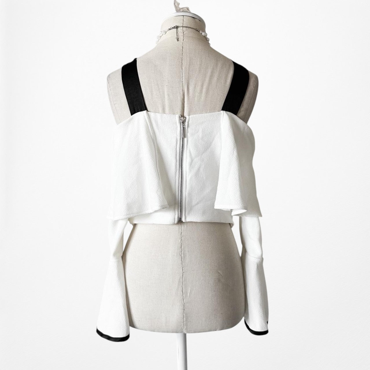 Backstage White Black Bow Tie Cold Shoulder Bell Sleeve Blouse Top Size S