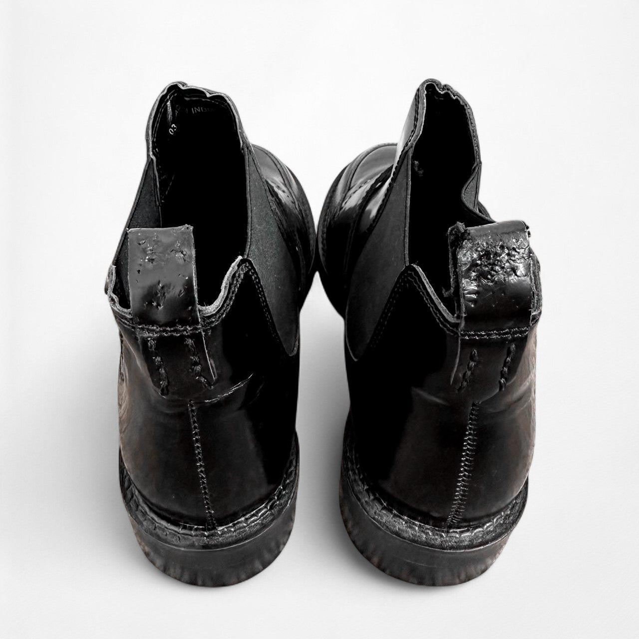 Ankle length. Buckled detail. Patent faux leather. Slip on. Small block heel. Round toe. Label is ASOS