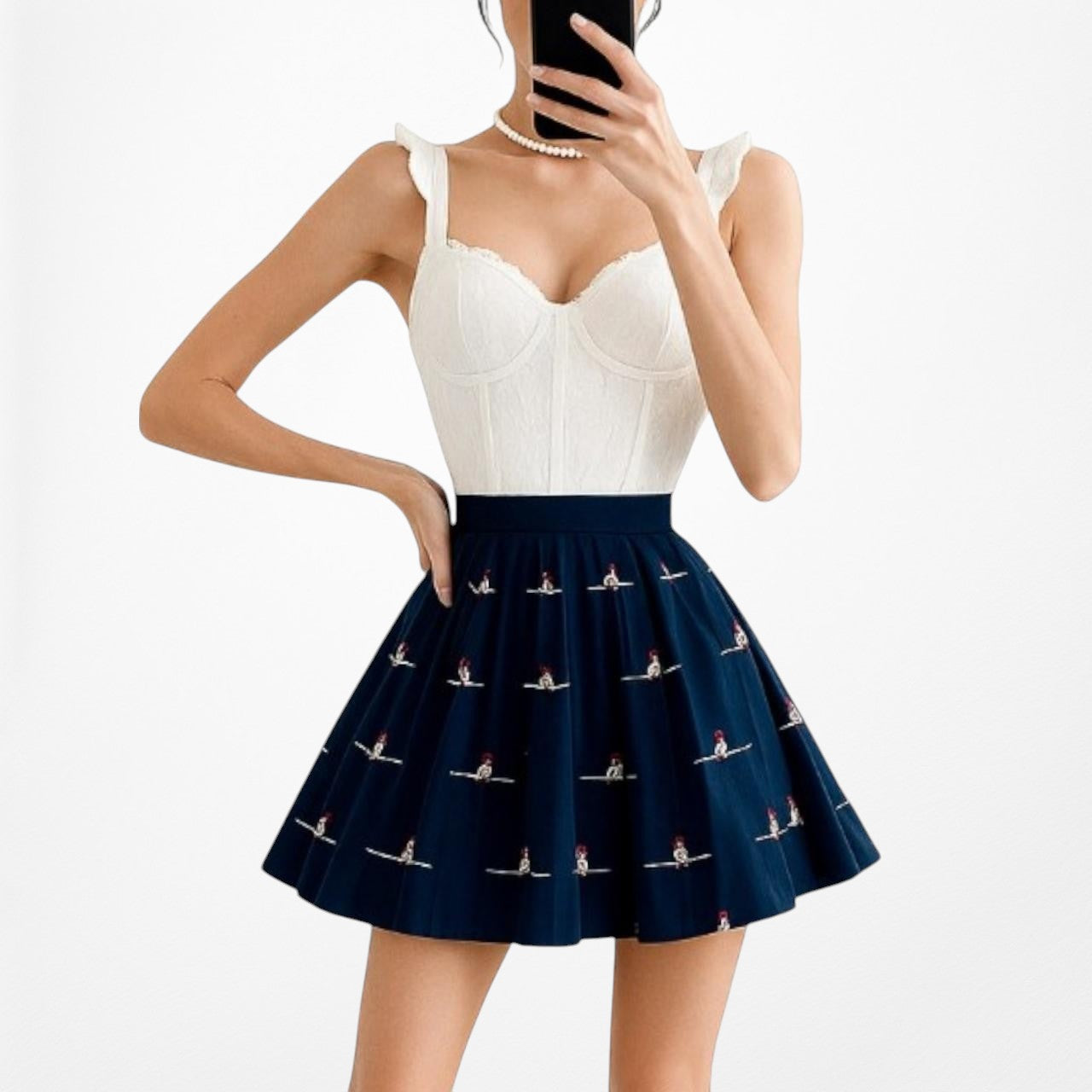 Blue high waisted pleated skater mini skirt. Features animal bird print. Elasticized waist.
