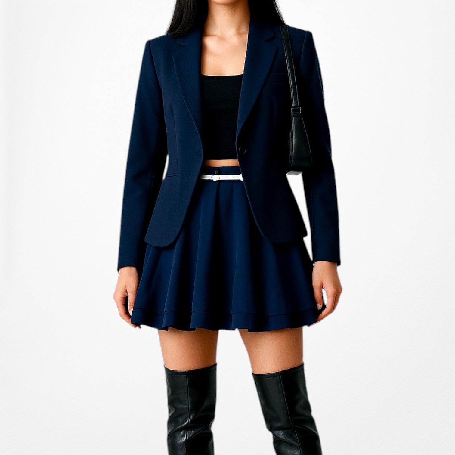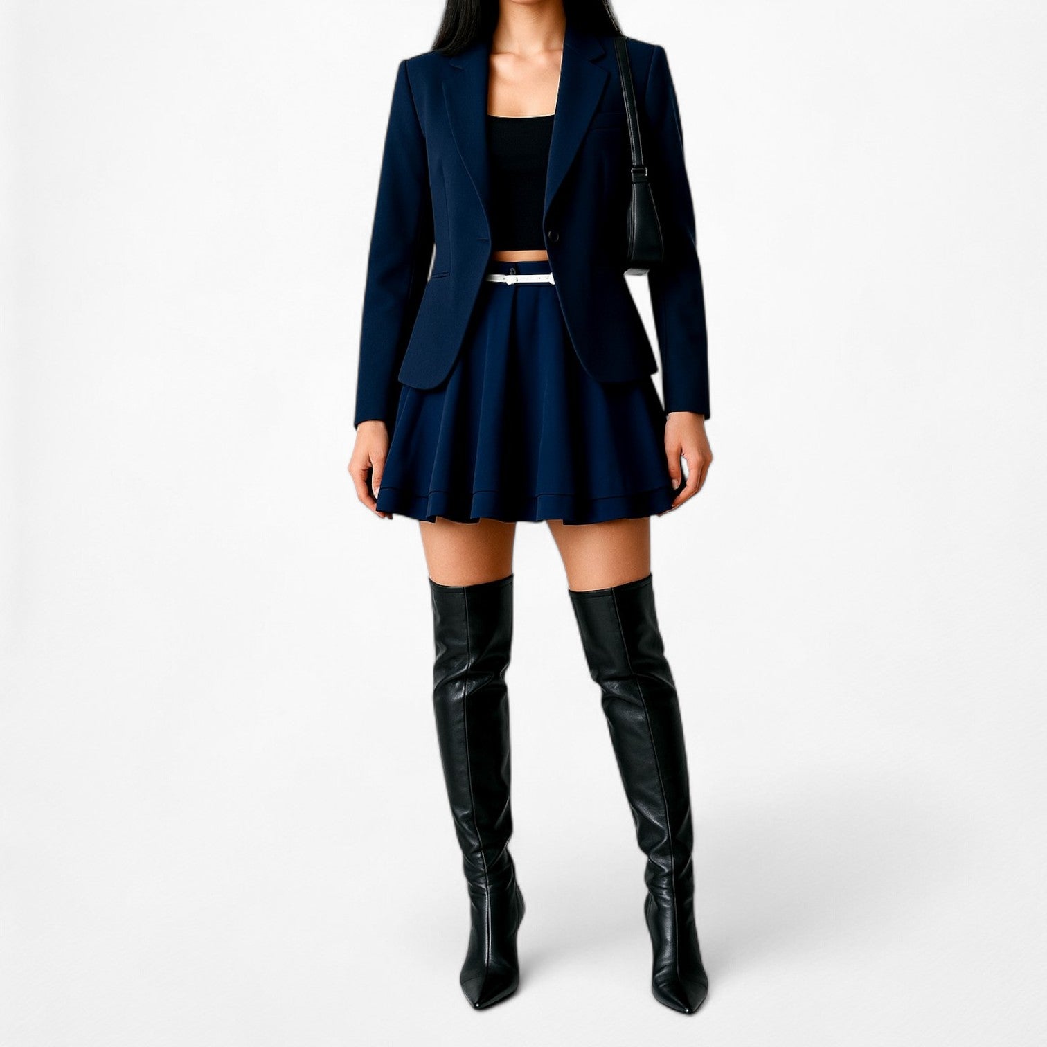 Navy Blue pleated flared skater mini skirt. Beaded at the waist. Back zip closure.