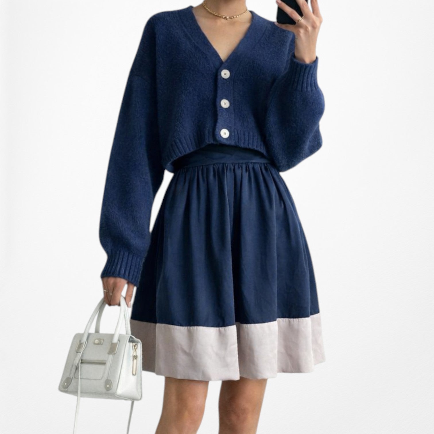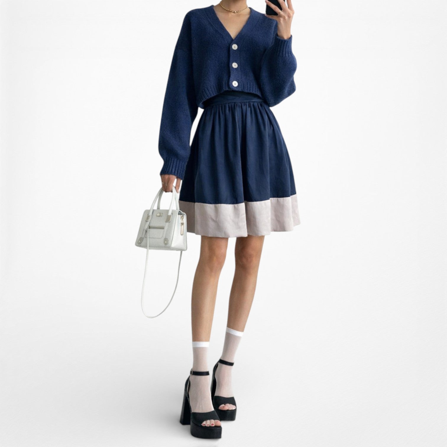 Satin fabric. Elasticized waist with side zipper closure. Colorblock. High waisted. Pleated detail. Skater flared silhouette