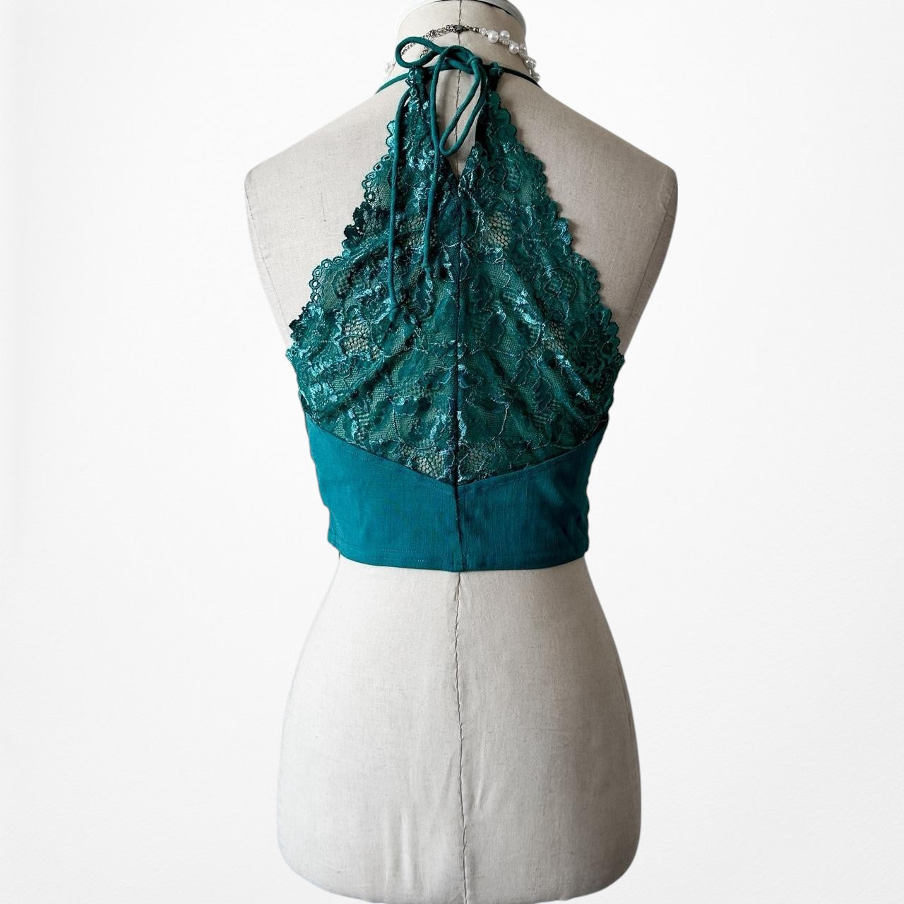 Features lace detail on the bust and back. Halter V-Neck that ties at the back. Pullover/slip on