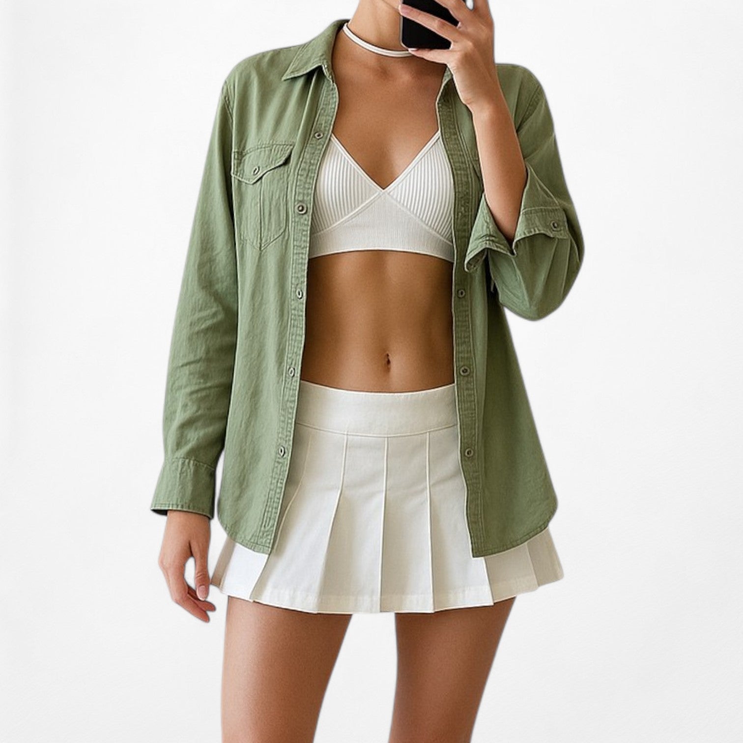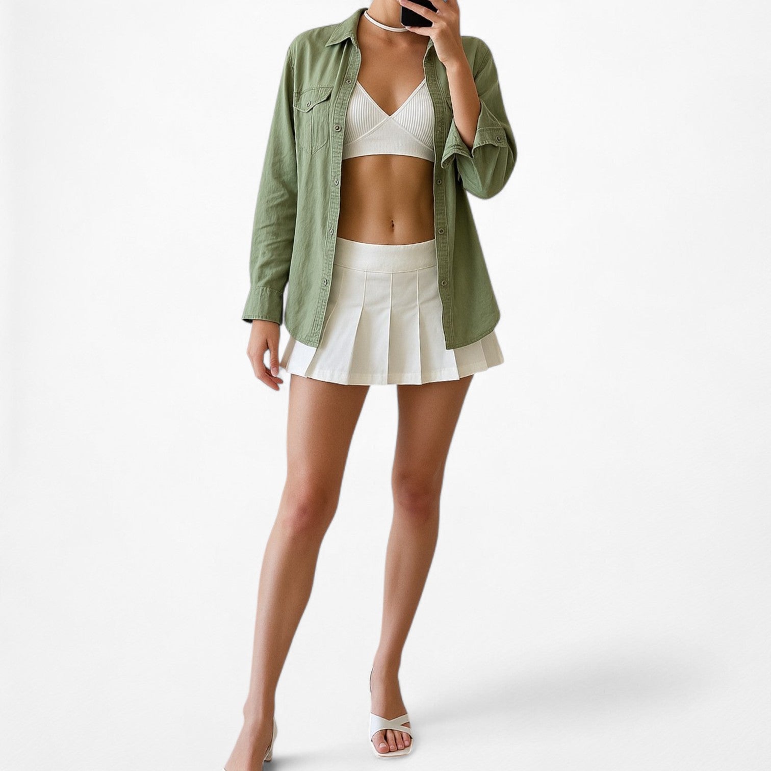 Olive green button down shirt. Two front pockets. Wear it loose or fitted.