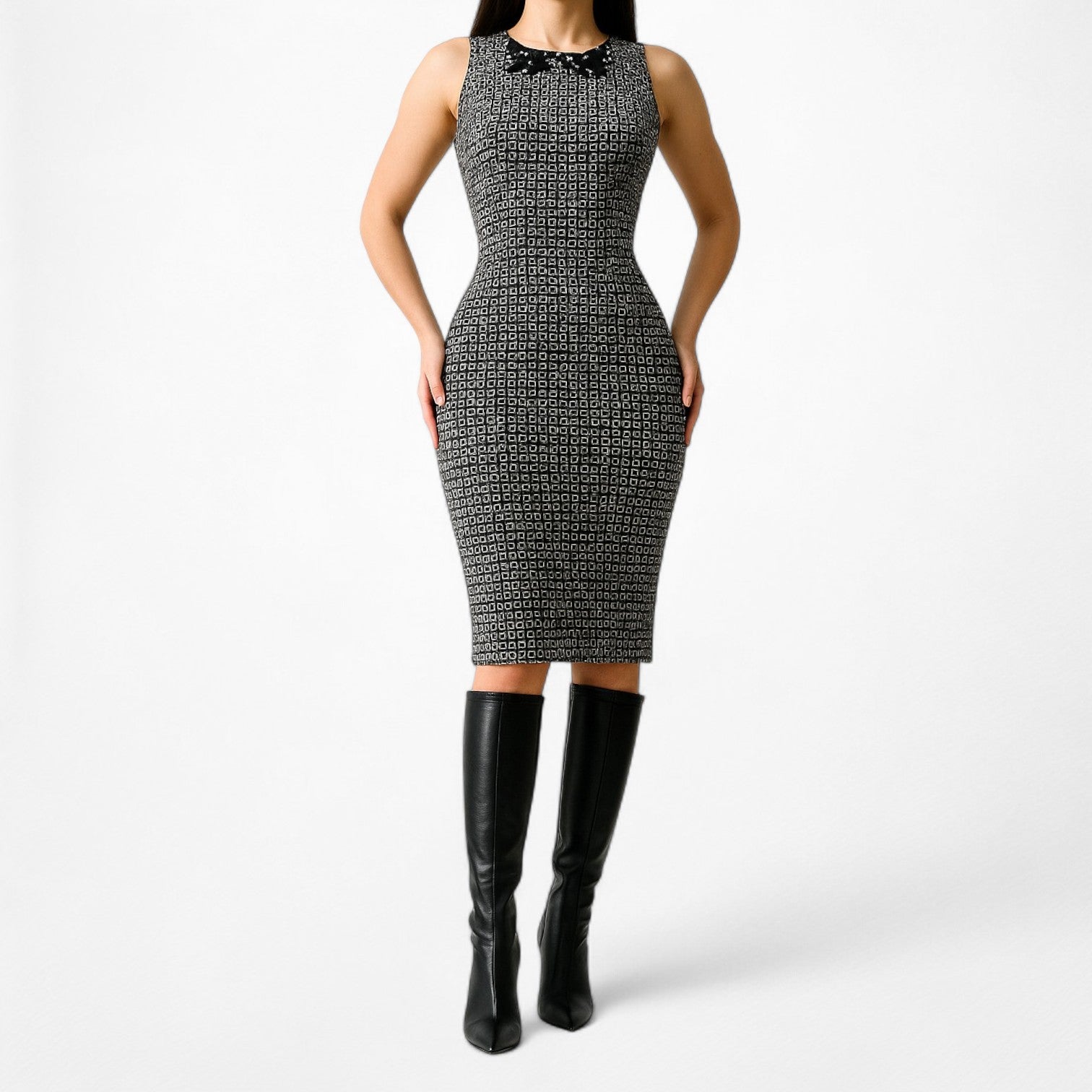A cocktail bodycon knee length dress featuring checkered prints and a crew neck. Zips up in the back.