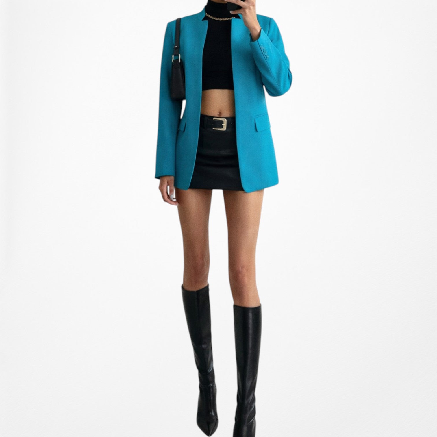 Vintage Y2K turquoise open front blazer jacket with structured padded shoulders and a sleek tailored silhouette. Features long sleeves, two front faux pockets, and no button closure for a clean minimalist look. Perfect statement layering piece for Y2K, office core, or night out outfits.