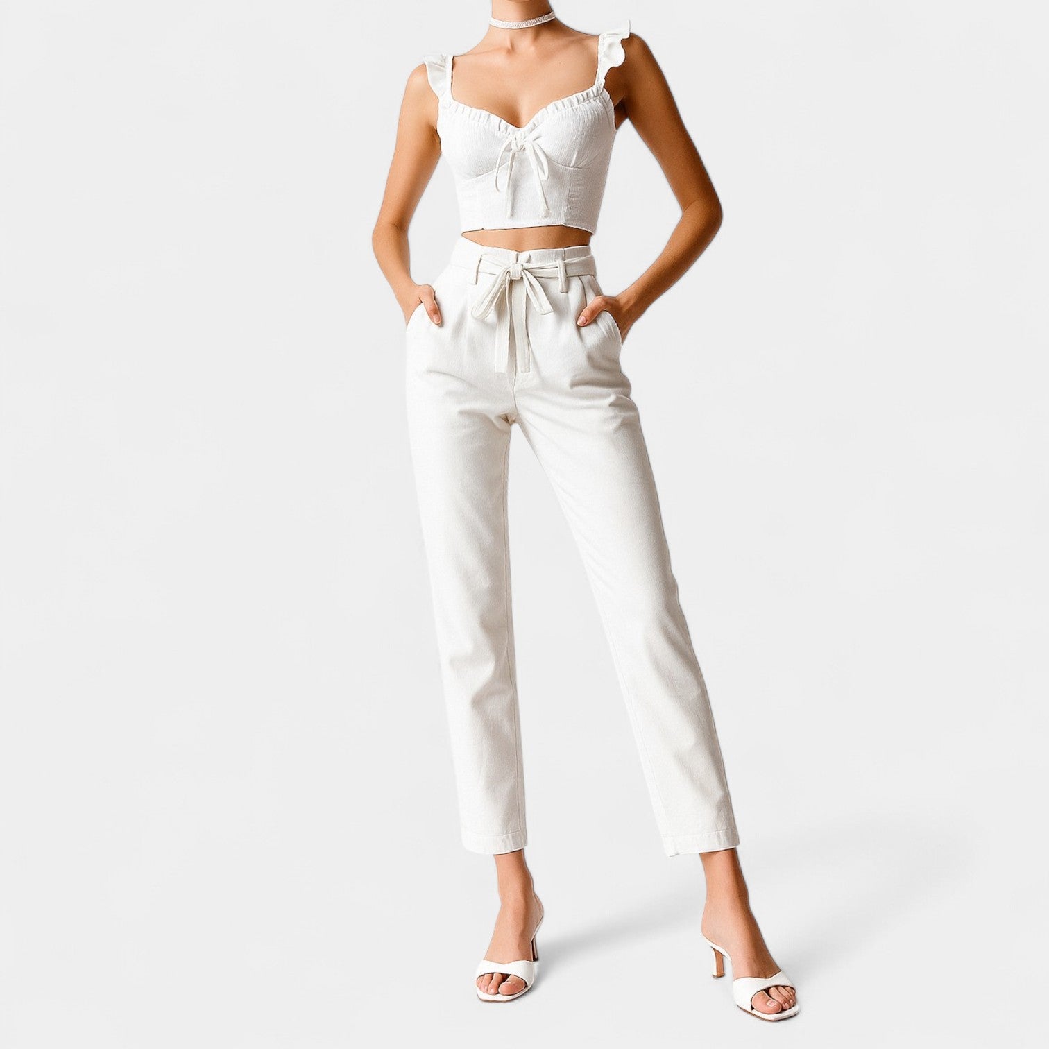 Y2K 2000s coquette off white cream high waisted cropped pants. Button and zip closure. Two front functional pockets. Two faux back pockets. Ties at the waist with elasticized back. Straight leg.