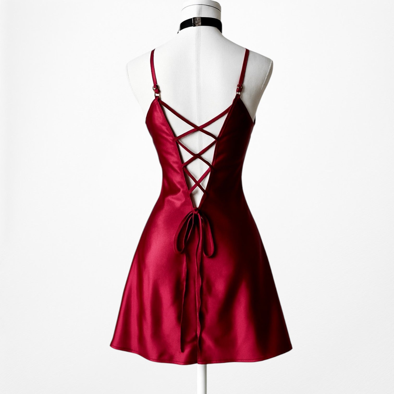Satin fabric. Lace V-neck. Spaghetti straps. Slip on/pullover babydoll lingerie style. Criss-cross back. Fit and flared