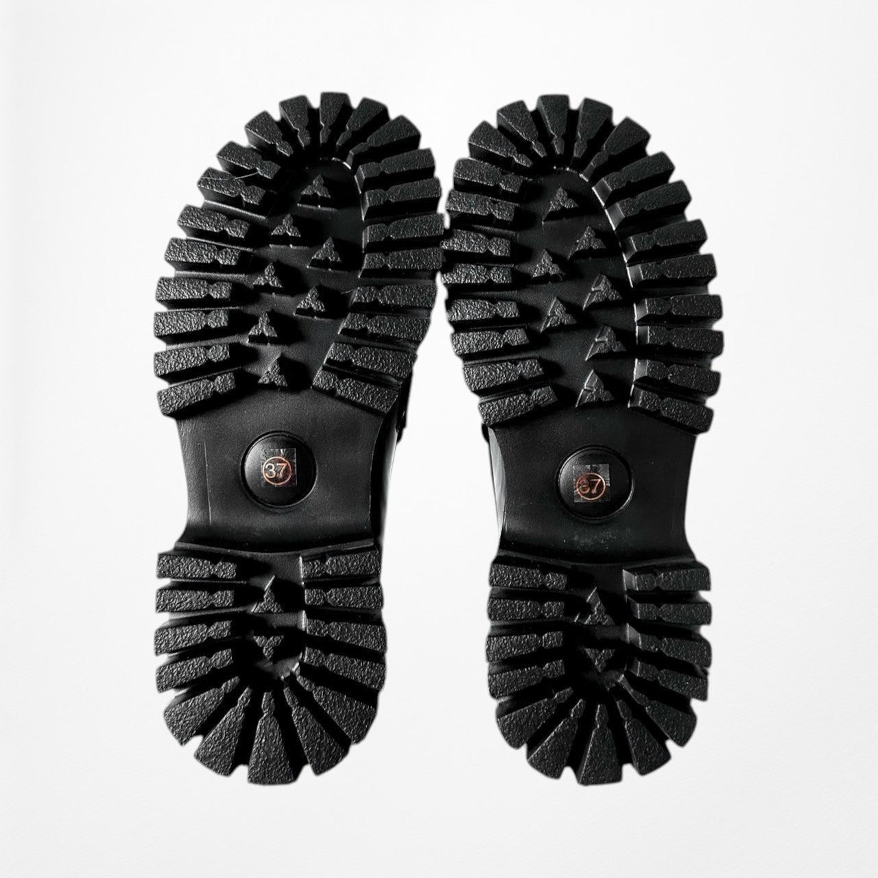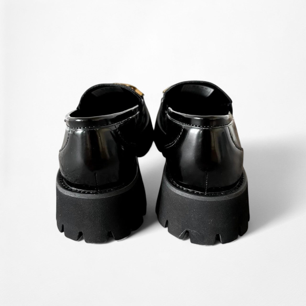 Patent faux leather platform loafers featuring gold chain detailing. Tagged as a Size 37. Label is Na-kd