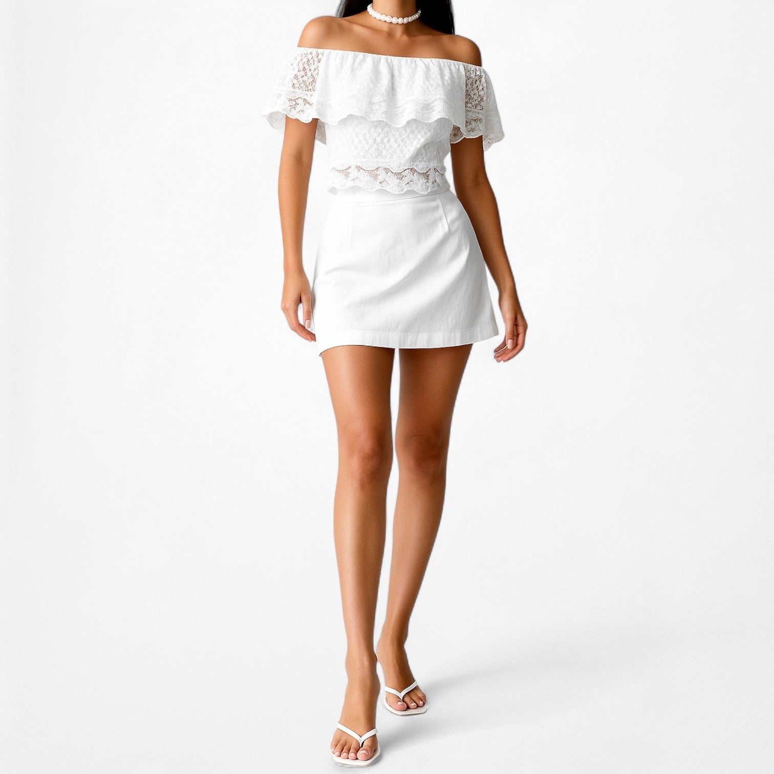A white off the shoulder ruffle crop top featuring intricate lace details throughout. Lined. Perfect for a summer vacation