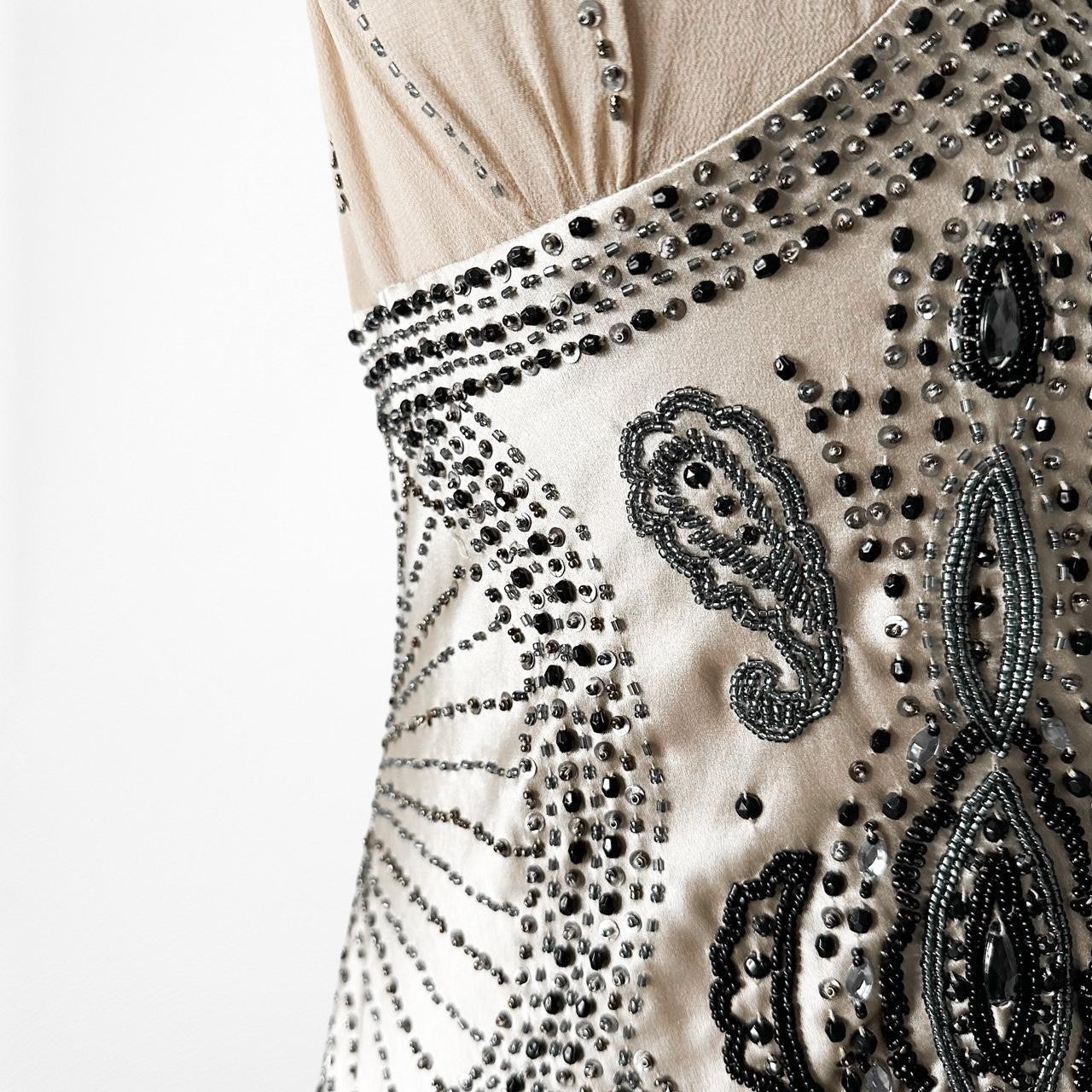 Vintage Ivory Beige Silk Beaded Bodycon Side Slit Maxi Prom Dress Size S/M