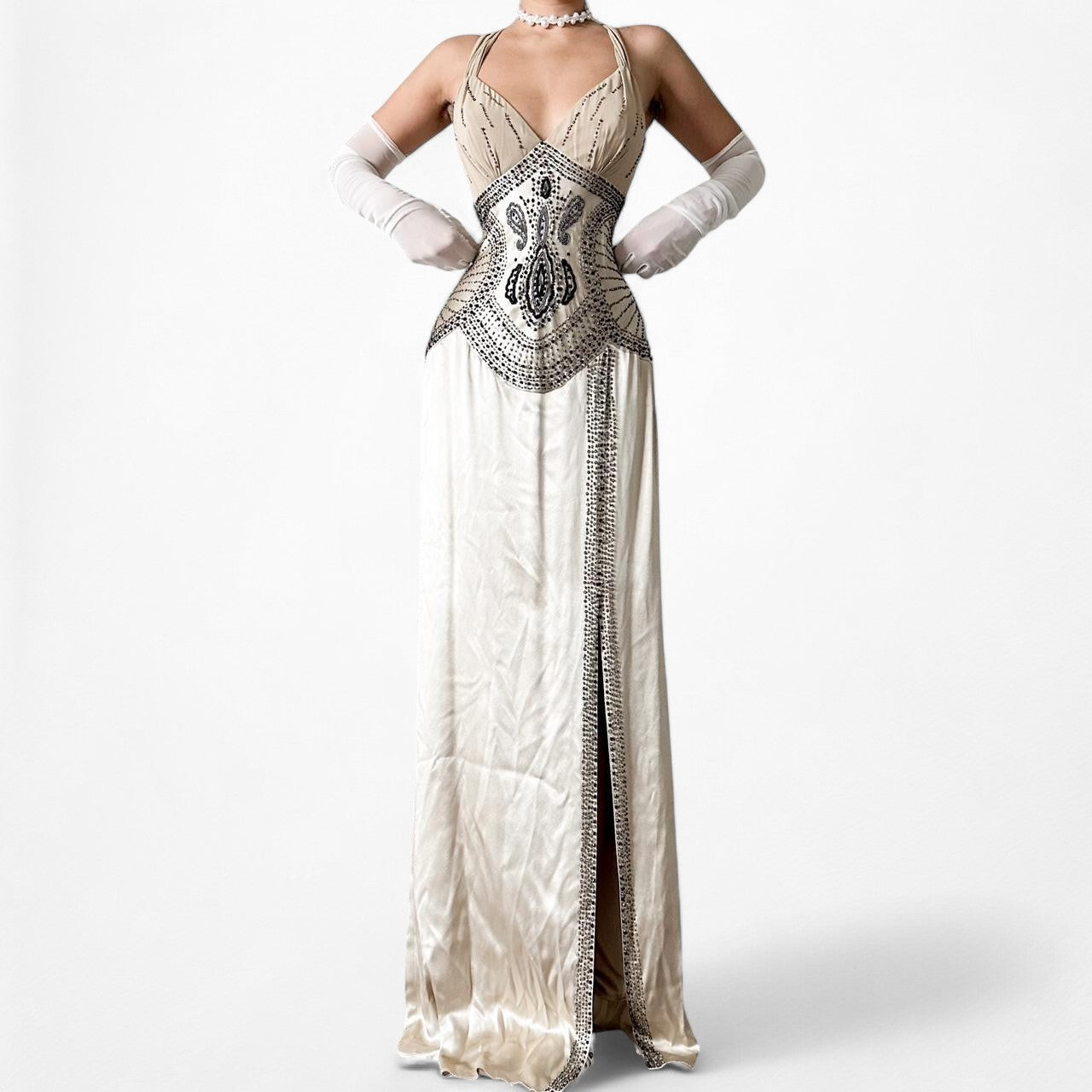 Y2K 2000s coquette fairy cream ivory maxi dress. Sweetheart neckline. Satin fabric. Side slit. Beaded on the bodice. Side zip closure. Padded.