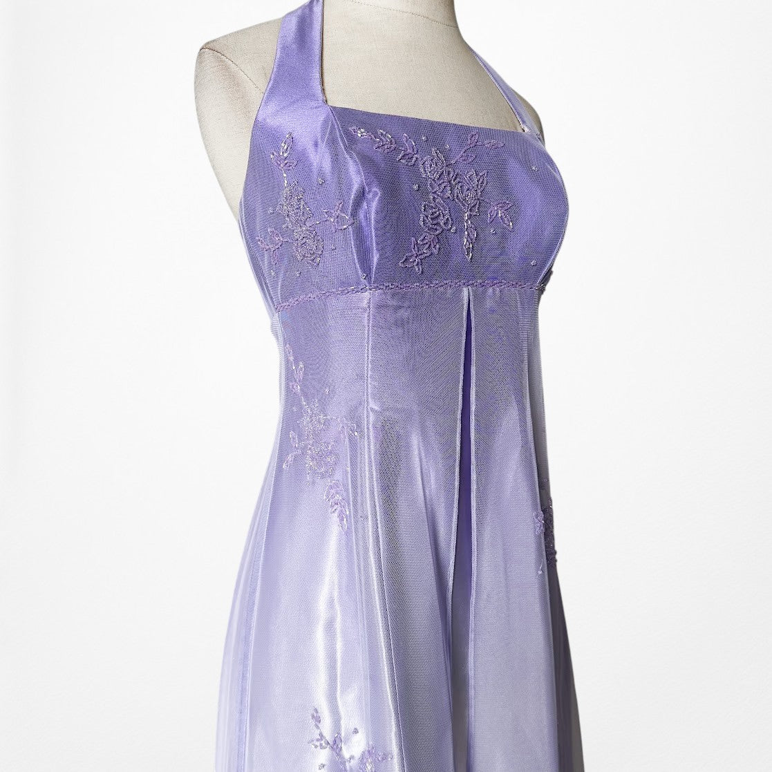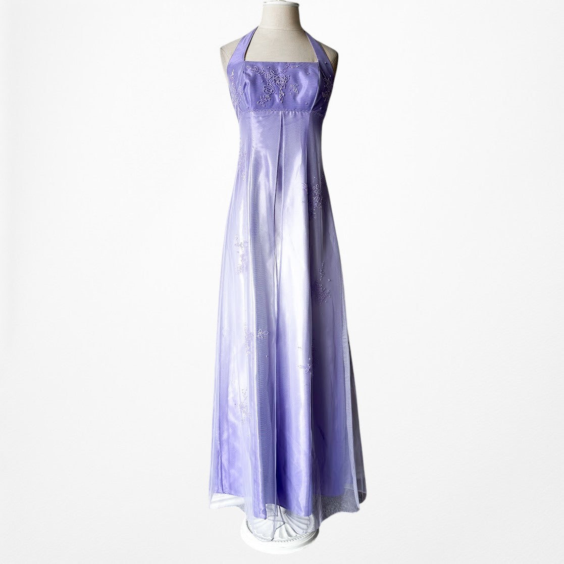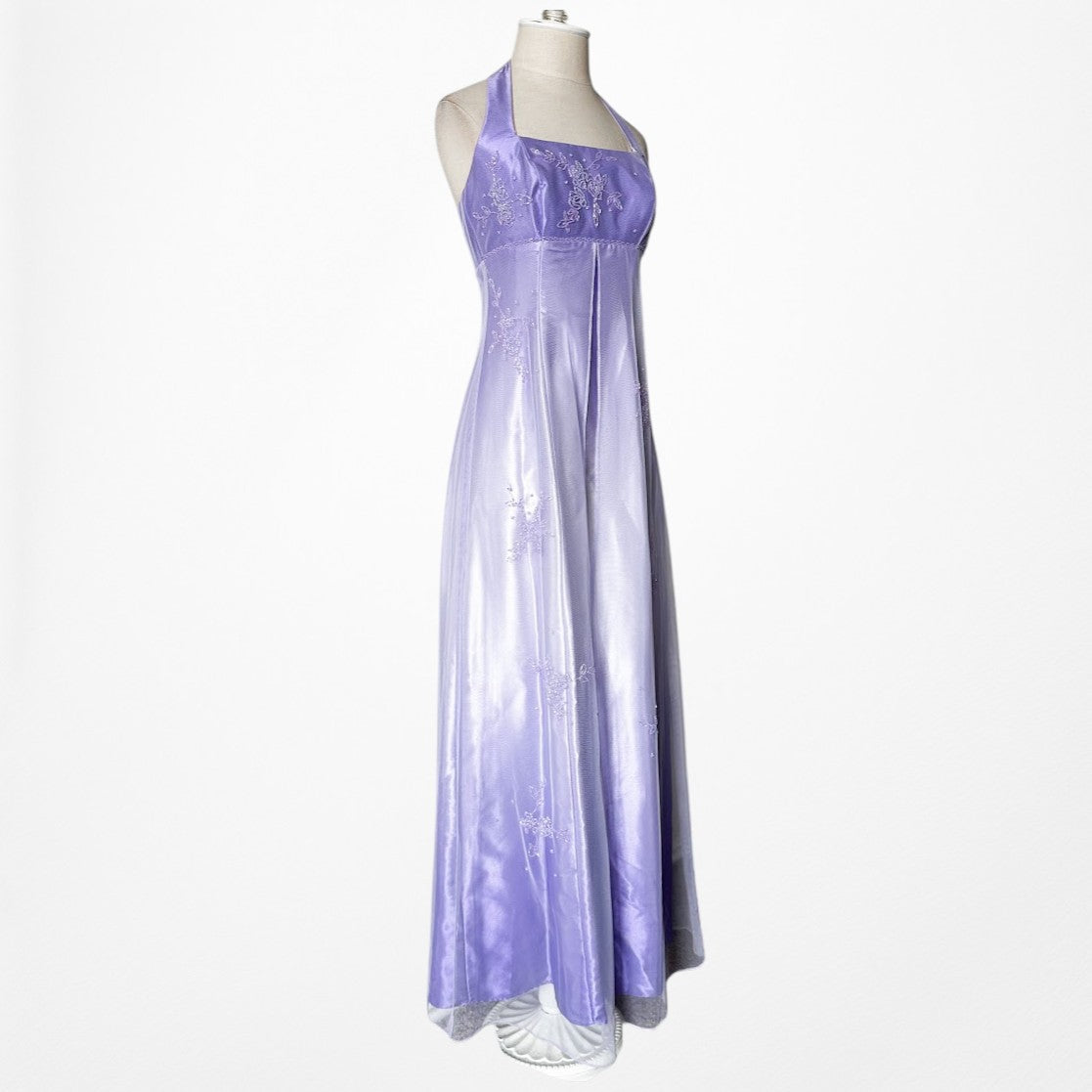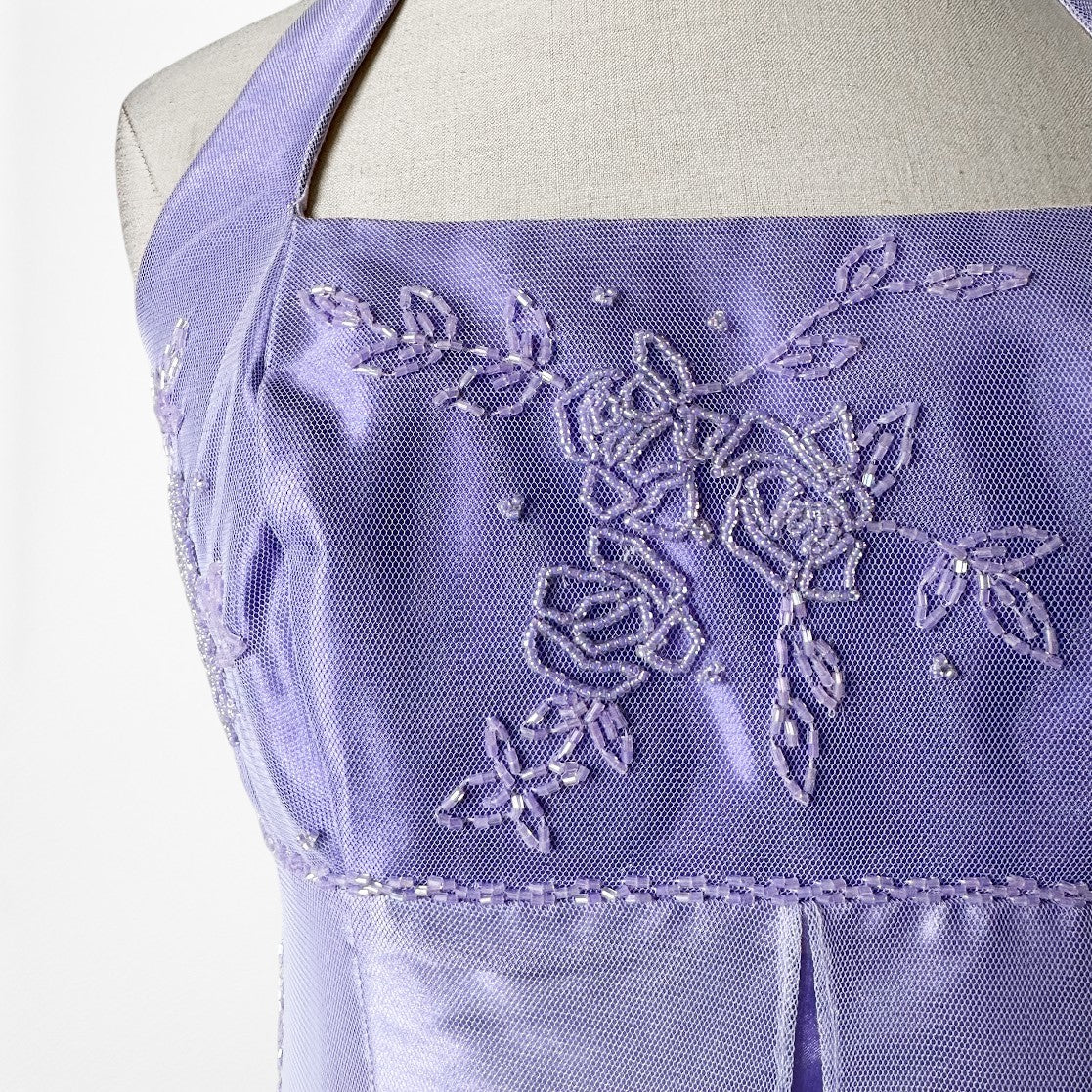 Y2K lavender satin halter gown with delicate floral beading and sheer mesh overlay. Fitted bodice with empire seam, floor-length silhouette, and elegant drape. Back zip closure. Perfect for prom, formal events, fairycore, coquette, or vintage 2000s eveningwear.