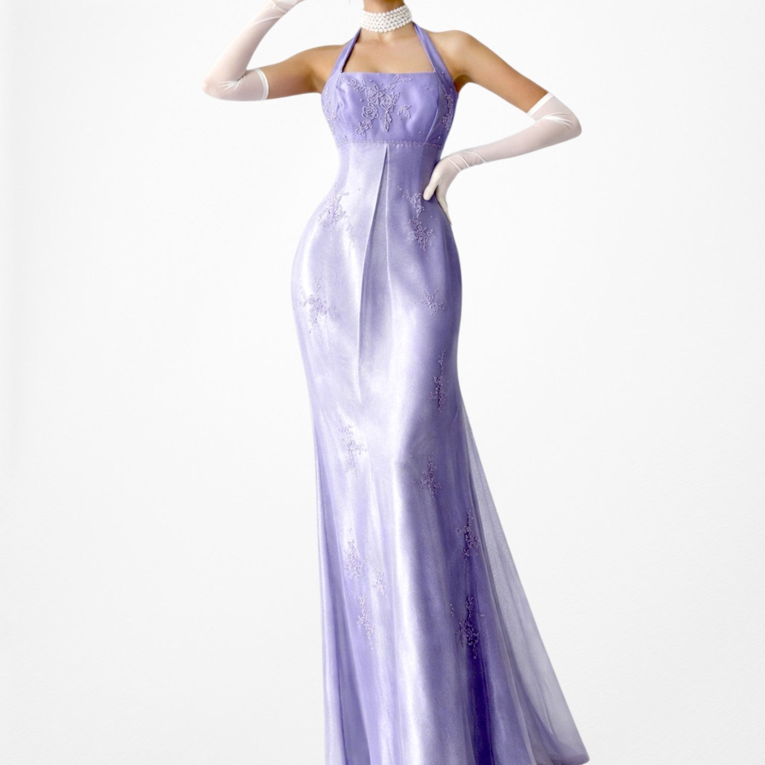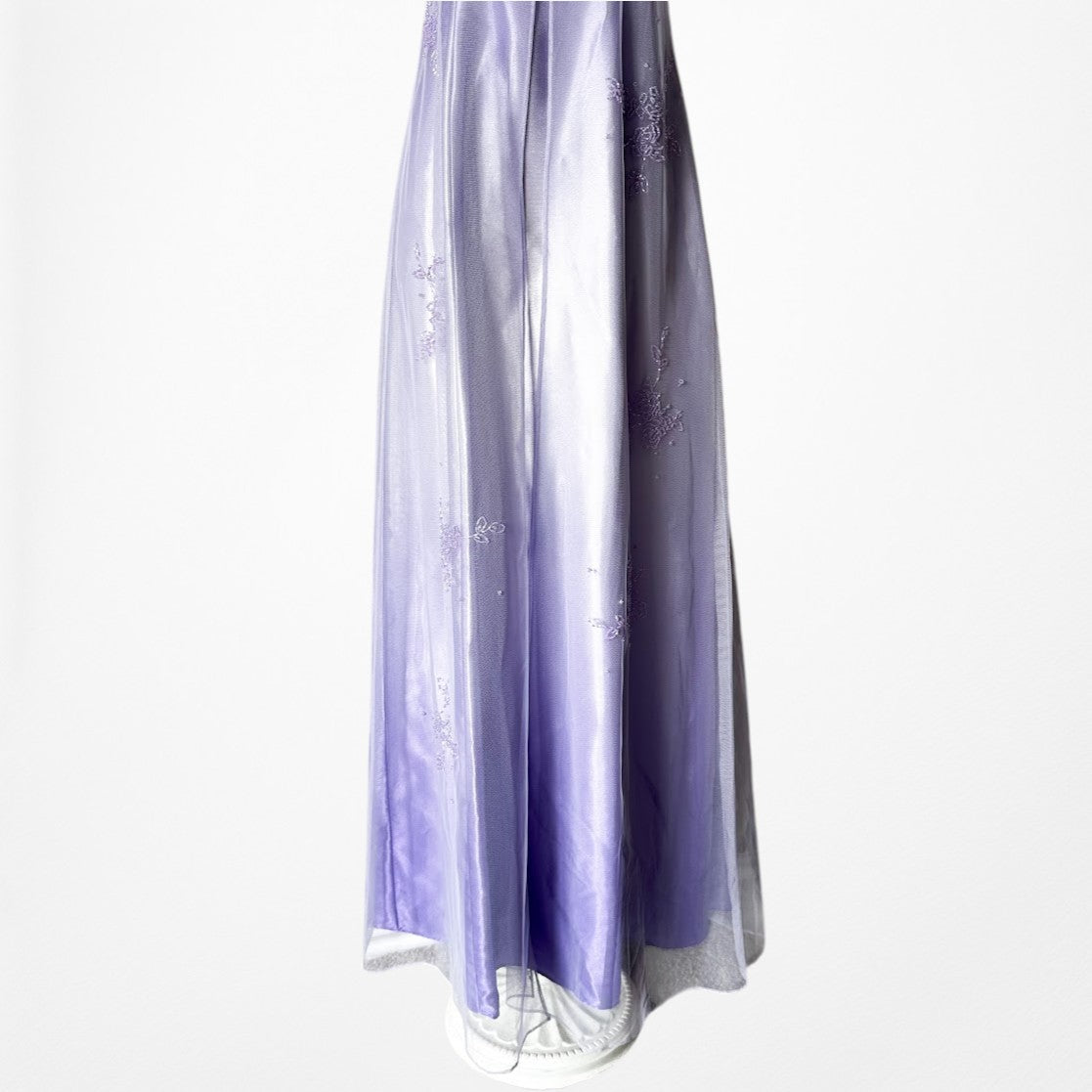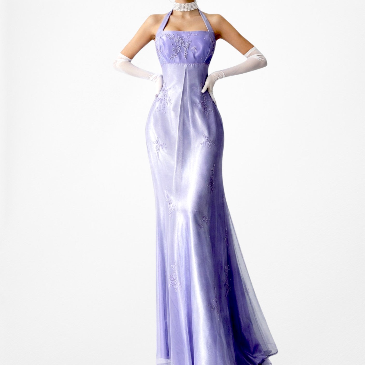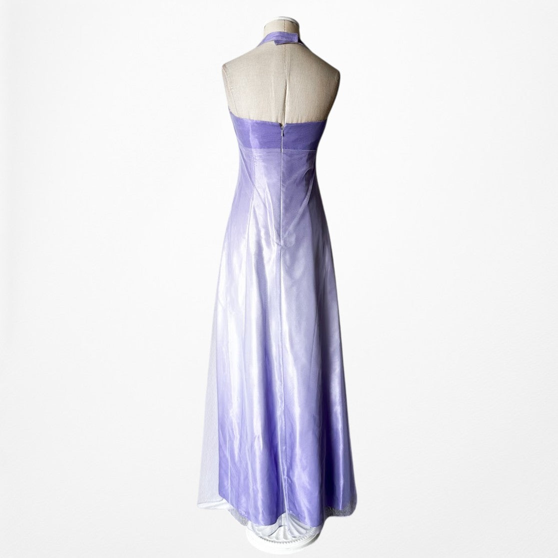 Y2K lavender satin halter gown with delicate floral beading and sheer mesh overlay. Fitted bodice with empire seam, floor-length silhouette, and elegant drape. Back zip closure. Perfect for prom, formal events, fairycore, coquette, or vintage 2000s eveningwear.