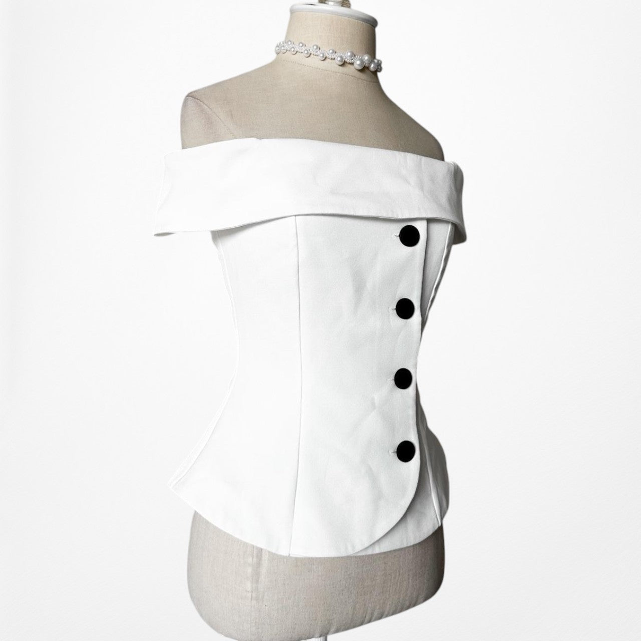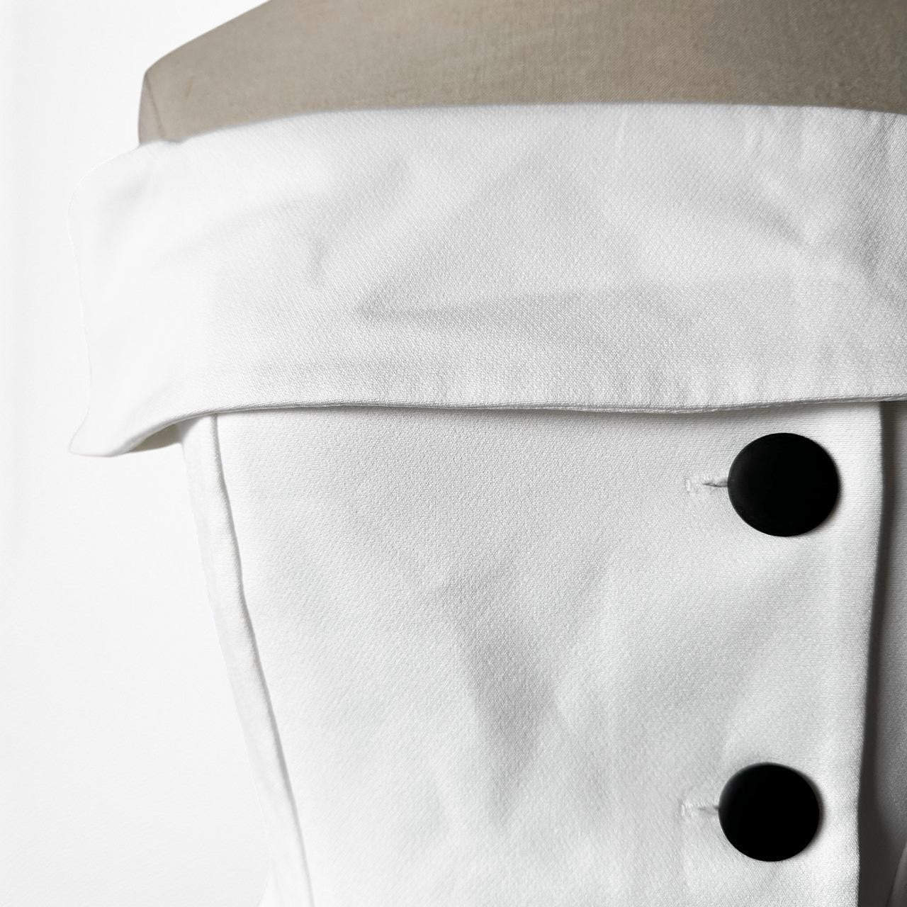 Features button front detailing. Peplum silhouette. Bustier corset style bodice. Back zip closure