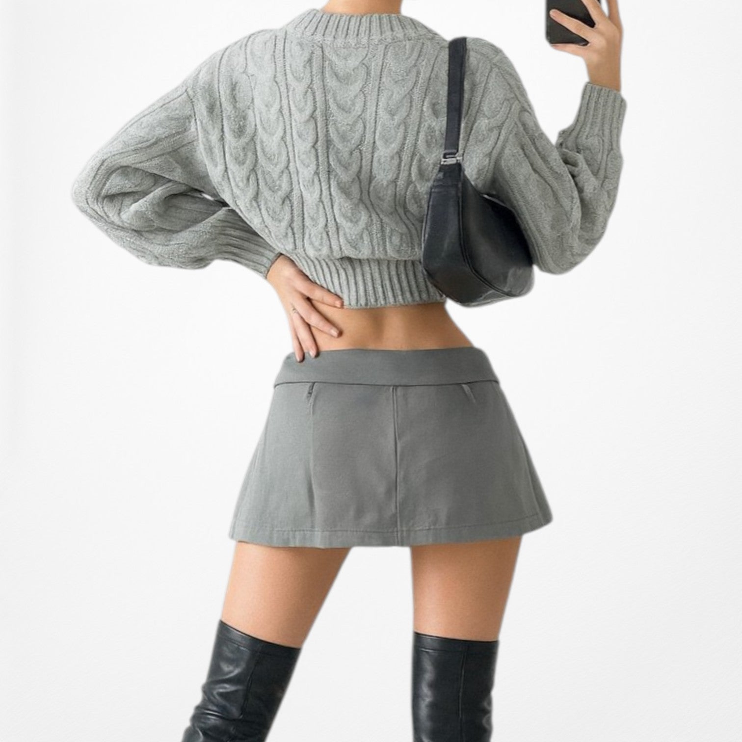 Flared skater style skort. Shorts underneath. Front zip closure.