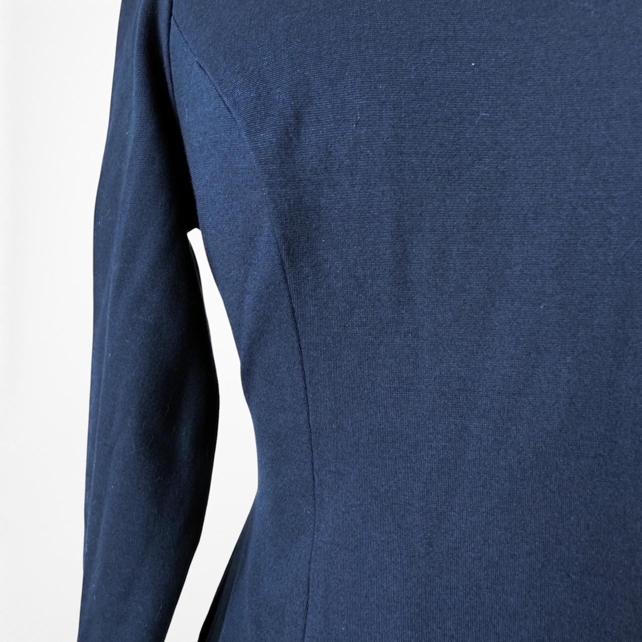 Vintage blue knit knee length bodycon dress. 3/4 sleeve. Zips up in the back. Two front pockets. Unlined.