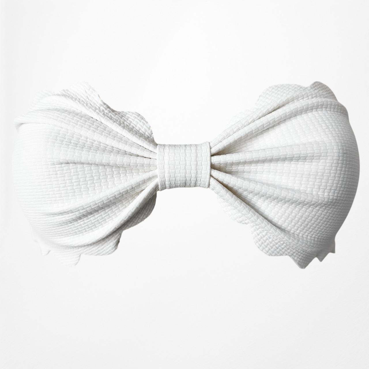 Cream/ivory in color. Strapless baudeau bow style top with clasp closure. High waisted bottom with pom pom striped mesh details. Bottom is from Tularosa. Top is from Marysia Swim.