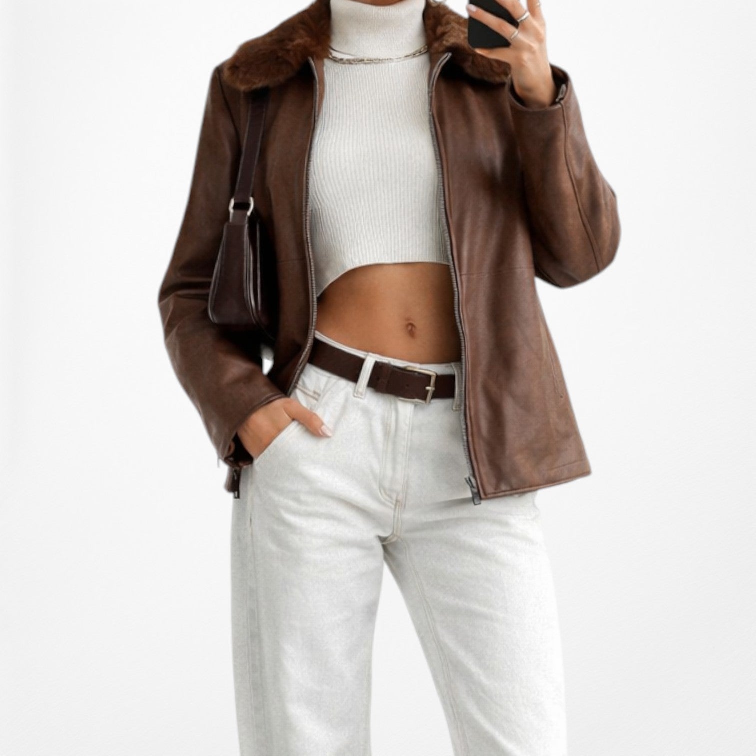 Motorcycle style brown leather jacket featuring detacheable fur collar trimming. Zips up in the front. Can be worn fitted or oversized. Two front side pockets.
