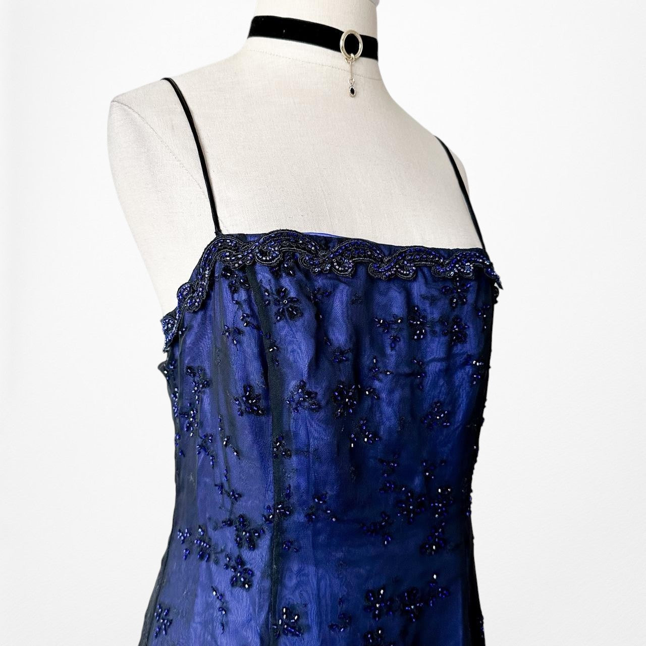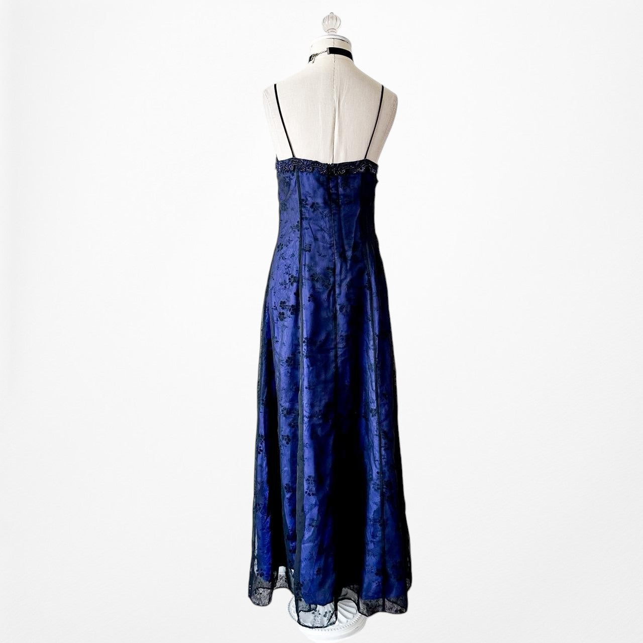 Vintage Blue Black Mesh Velvet Beaded Flared Maxi Prom Dress Size M