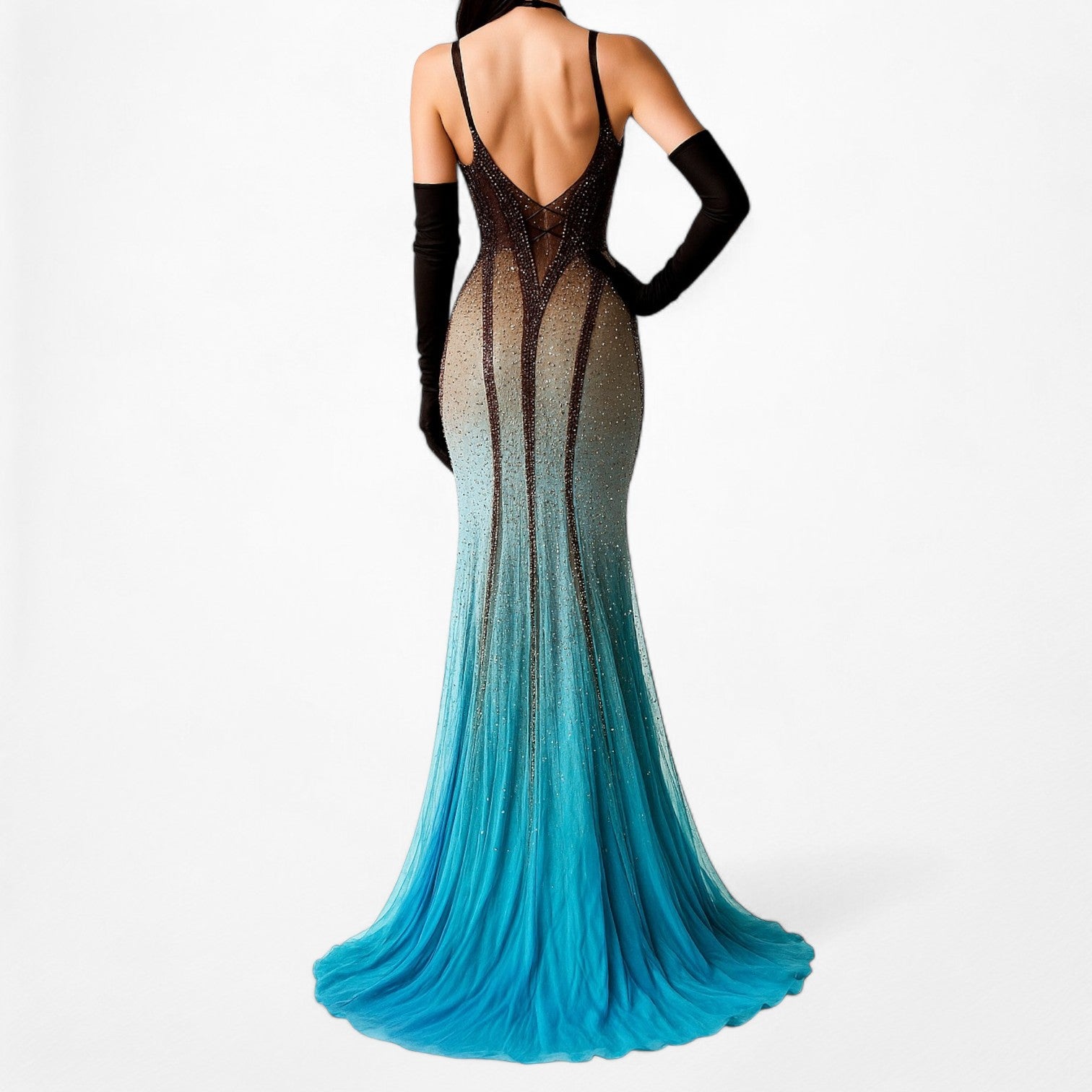 Y2K 2000s coquette fairy brown blue maxi bodycon dress. Fishtail silhouette. V-Neck. Sleeveless. Beaded throughout over a flowy ombre fabric. Padded.