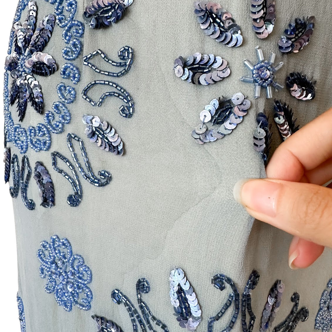 Pre-loved. Excellent. Some missing beads/loose threads. A minor liquid stain (not very noticeable). Note the color blue of dress is more subtle in person