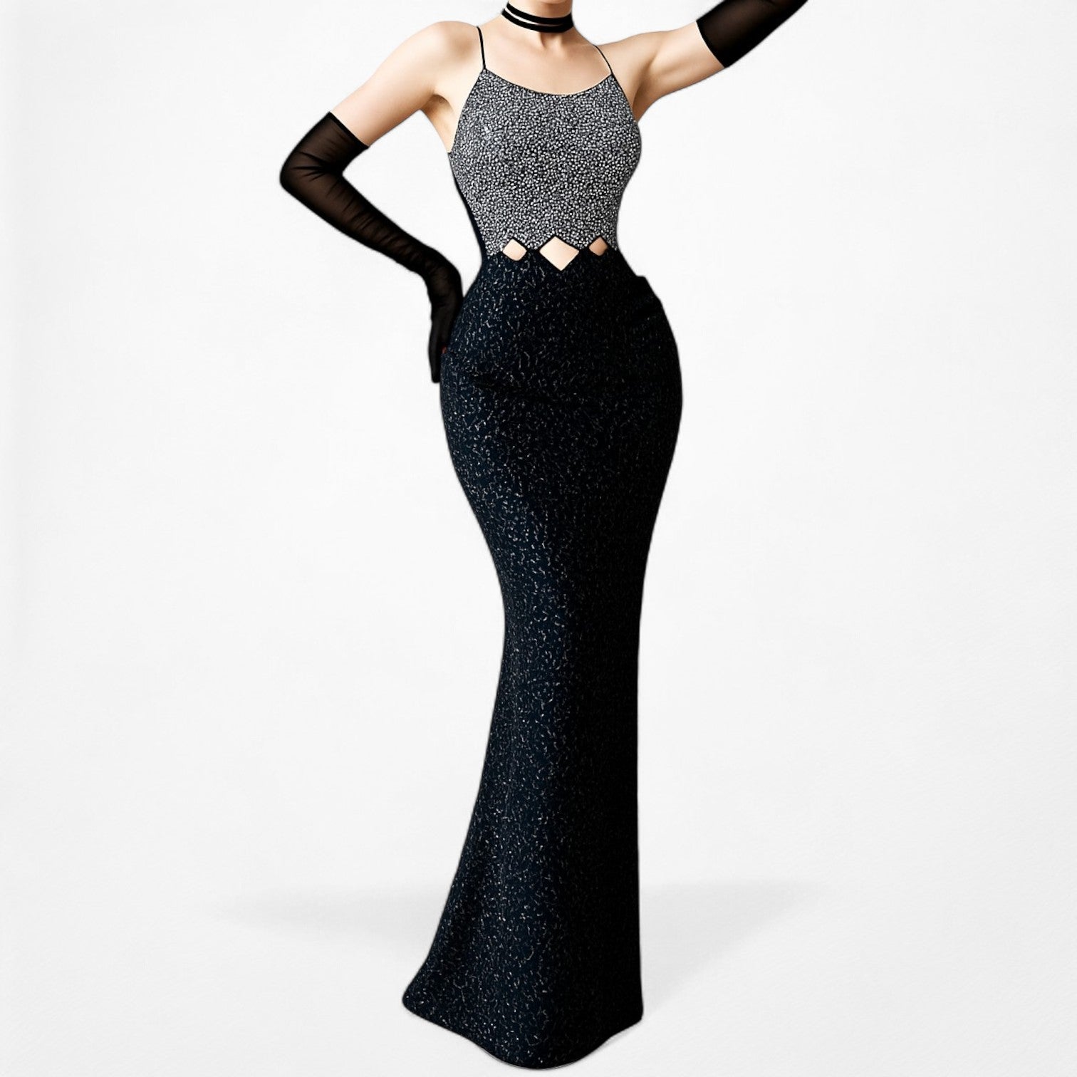 Y2K 2000s coquette fairy navy blue bodycon maxi dress featuring a scoop neck, spaghetti straps, triangle cutouts at the waist, and full beading throughout. Open back with slit and hook and zipper closure. Lined.