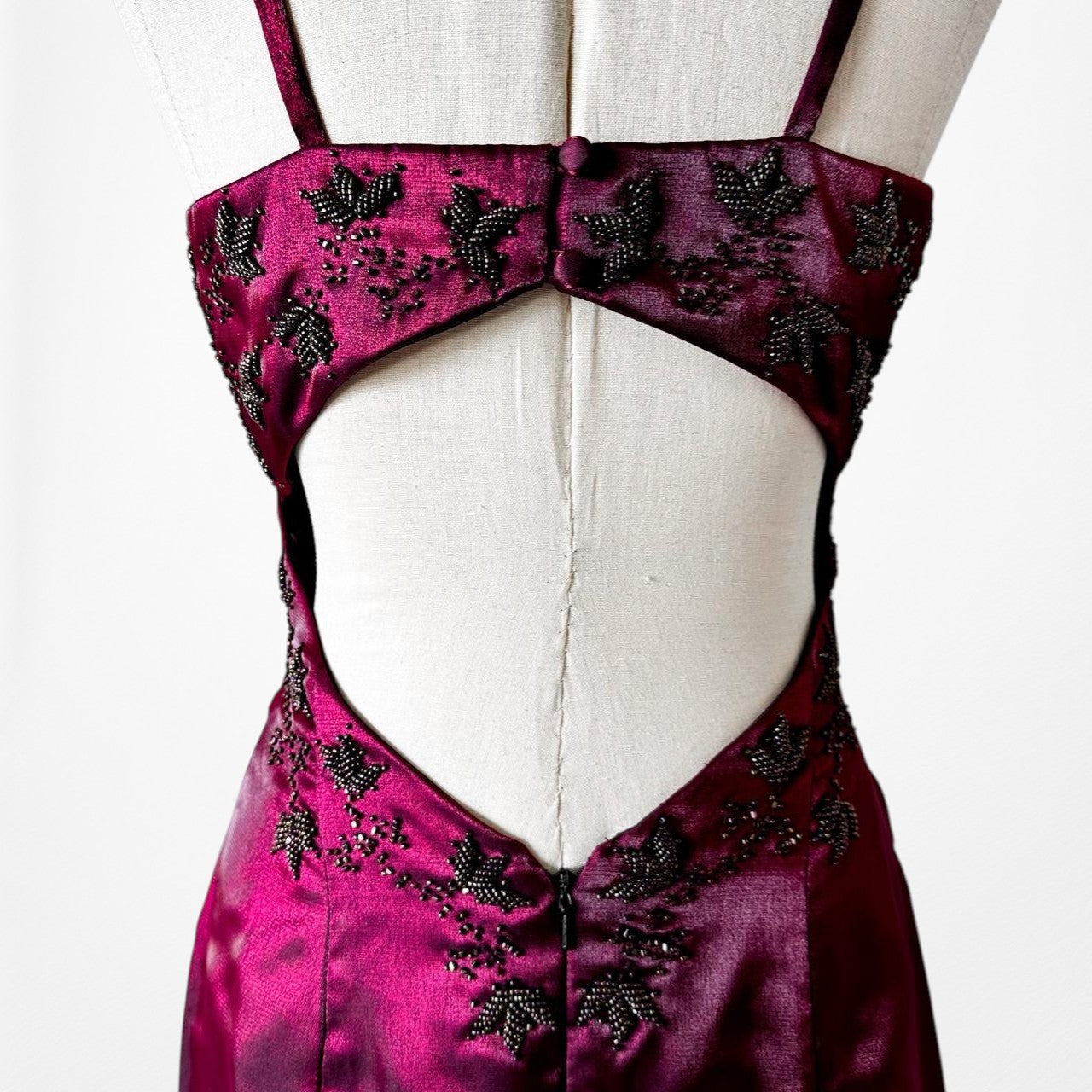 Vintage Burgundy Red Satin Beaded Fit Flared Maxi Prom Dress Size S