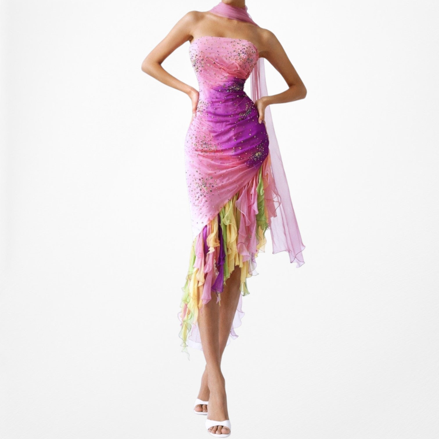 Y2K 2000s coquette fairy pink multicolor strapless bodycon midi dress. Beaded throughout. Ruffle asymmetric high low hem. Side zip closure. Padded. Shawl not included