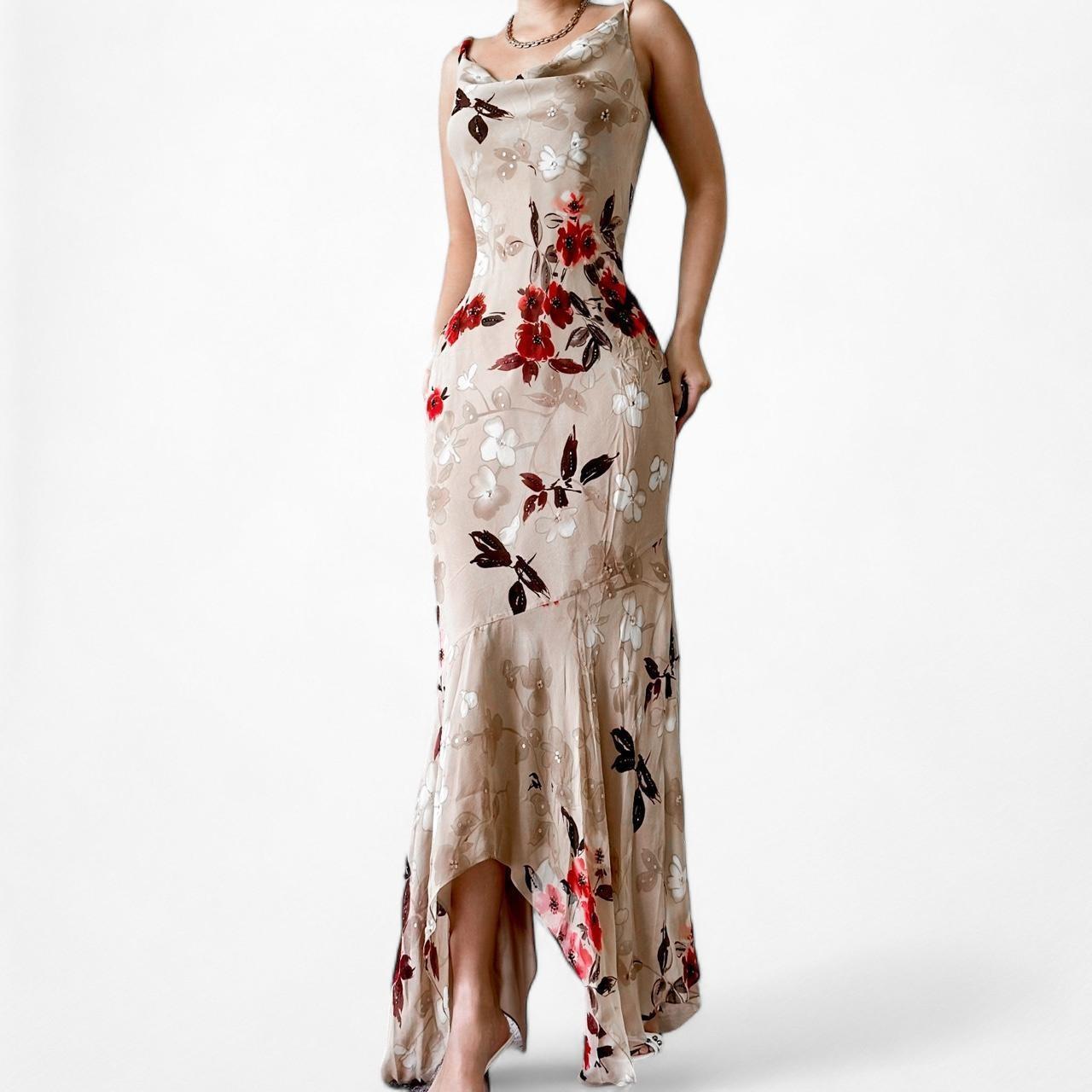 A vintage pullover brown beige red silk maxi sheath dress featuring floral prints, a cowl neck and beaded embellishments throughout. Lined. Pre-loved. Excellent. Almost like new. May have some loose threads/missing beads. No visible stains or tears