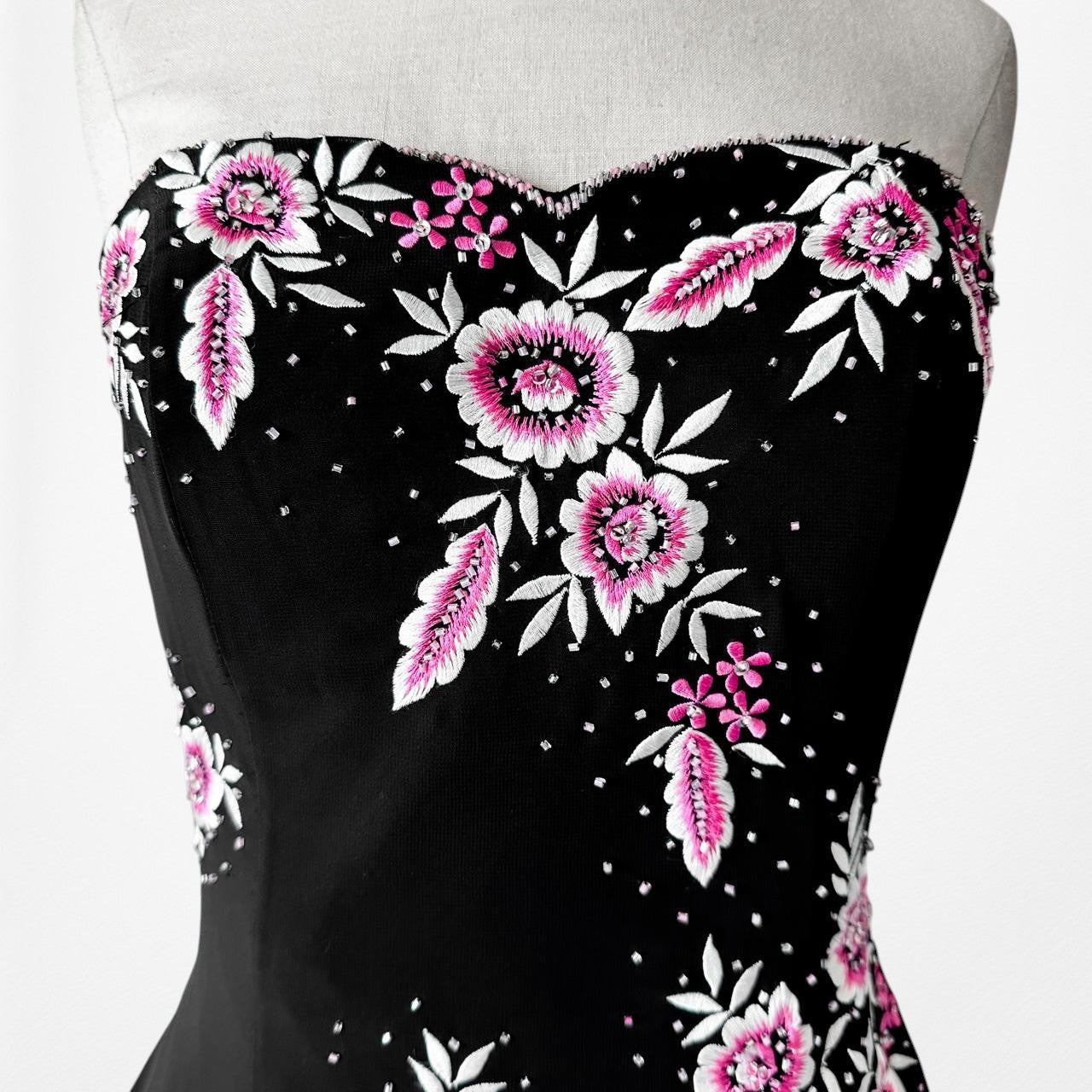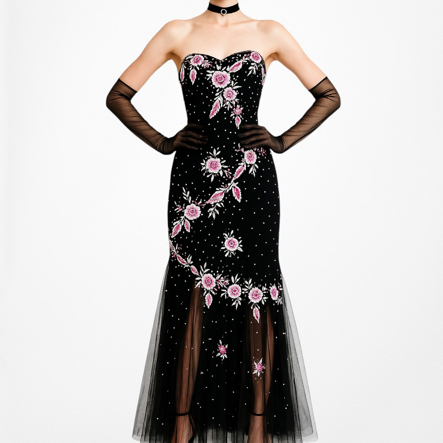 Y2K 2000s coquette fairy back maxi bodycon dress. Strapless. Sweetheart neckline. Floral embroidered beaded details throughout. Semi-sheer tulle hem fishtail bottom. Back zip closure. Padded