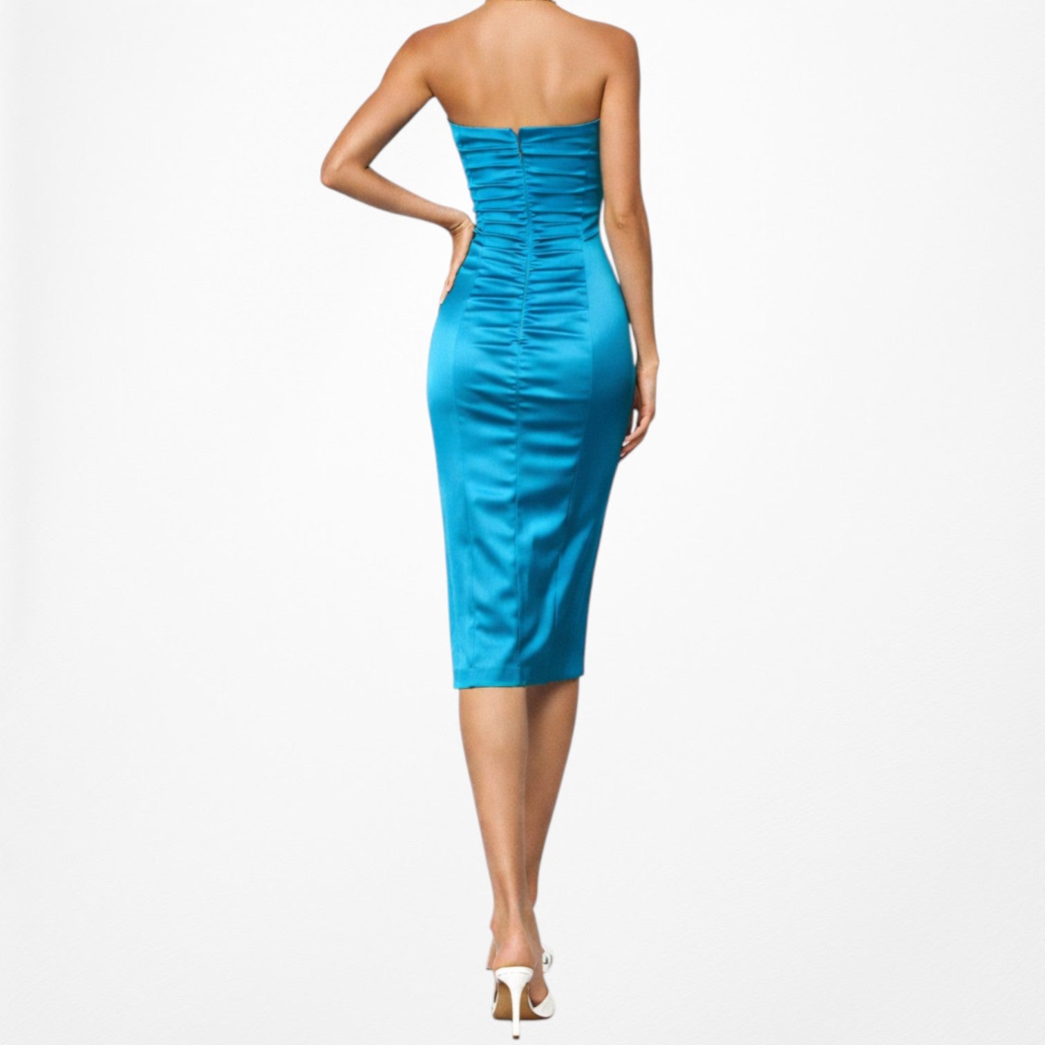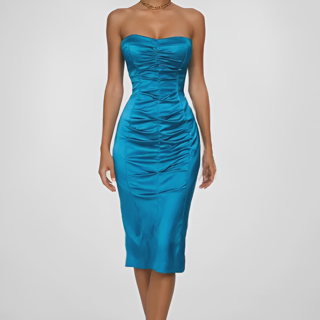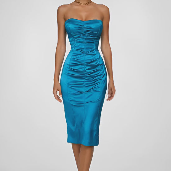 Vintage Y2K teal blue satin strapless bodycon knee length dress with ruched bust, padded cups, and back zip closure.