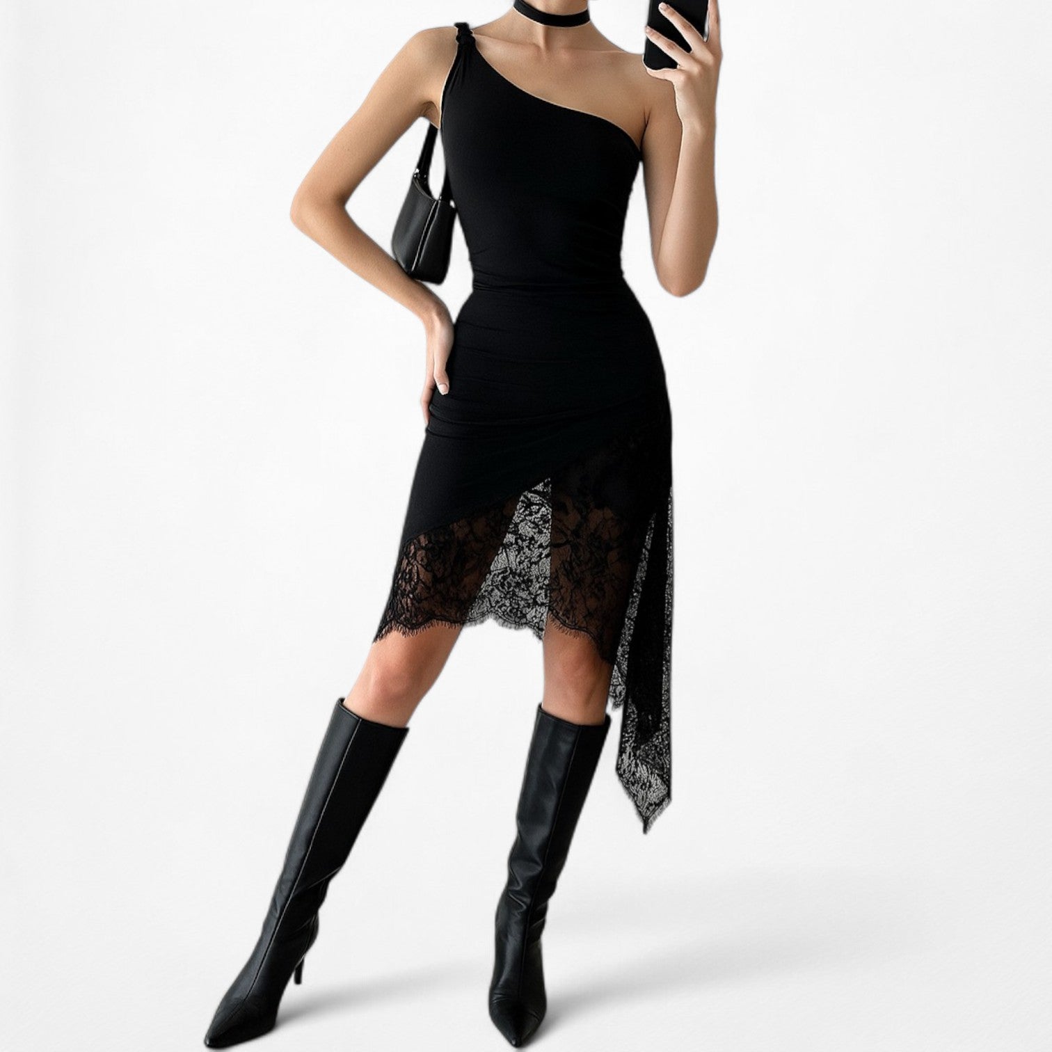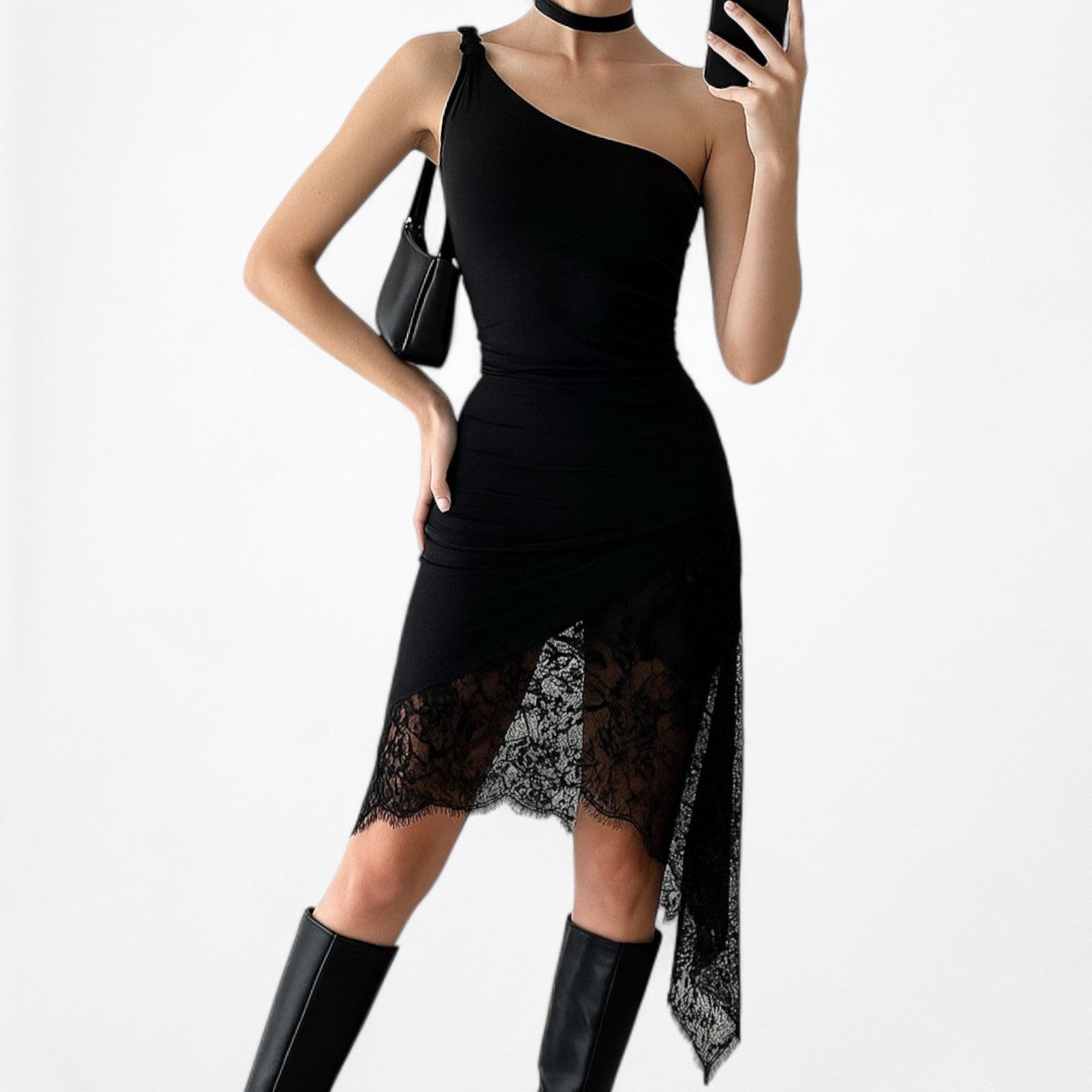 One shoulder with a knot detailing on the shoulder. Fitted. Pullover/slip on