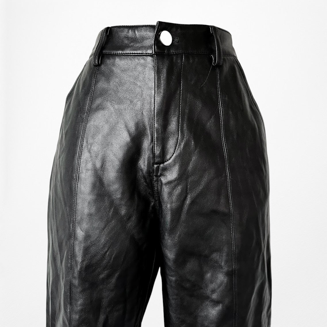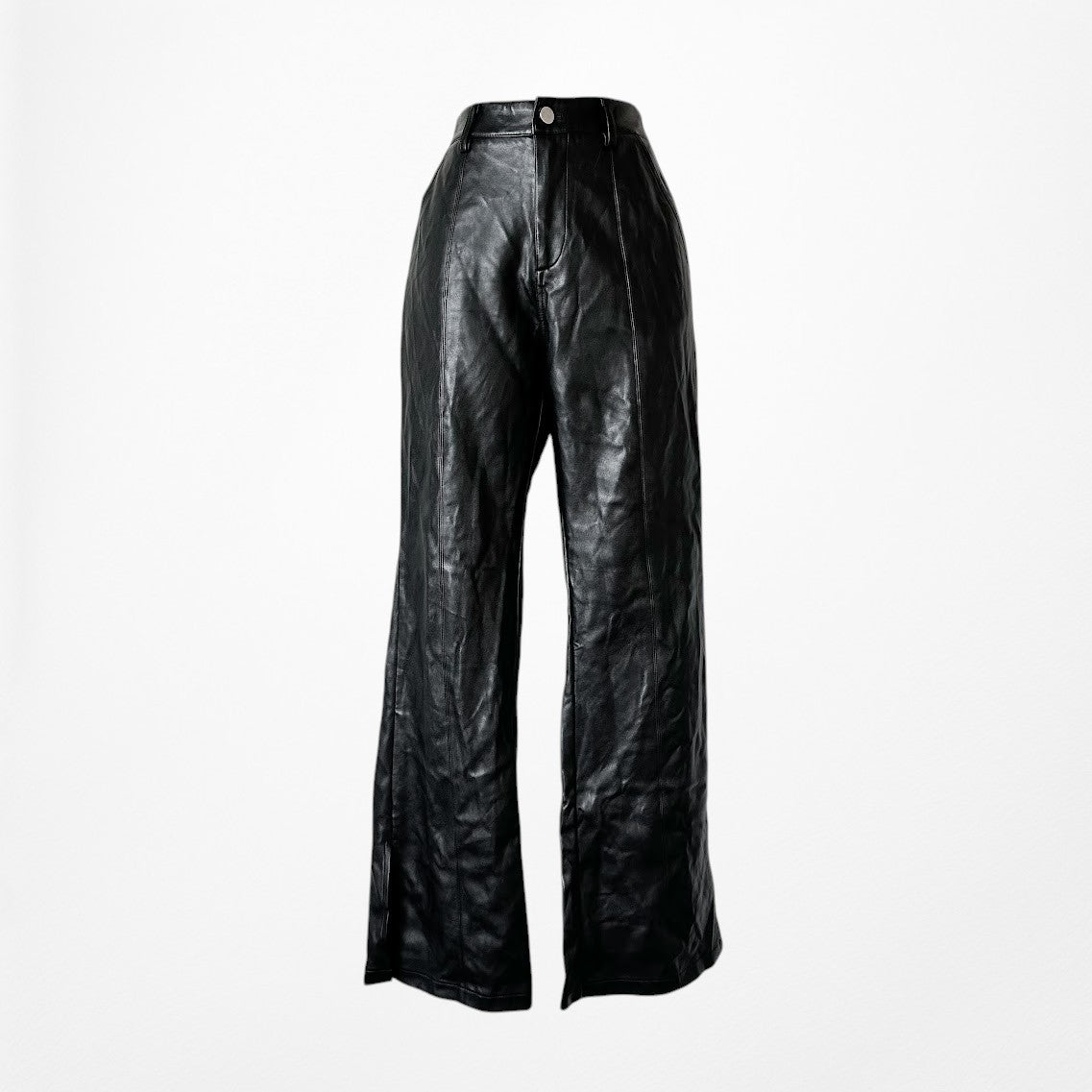 Vintage Y2K black boot leg faux leather pants. Slits on hem. High waisted. Button zip closure. Two front pockets