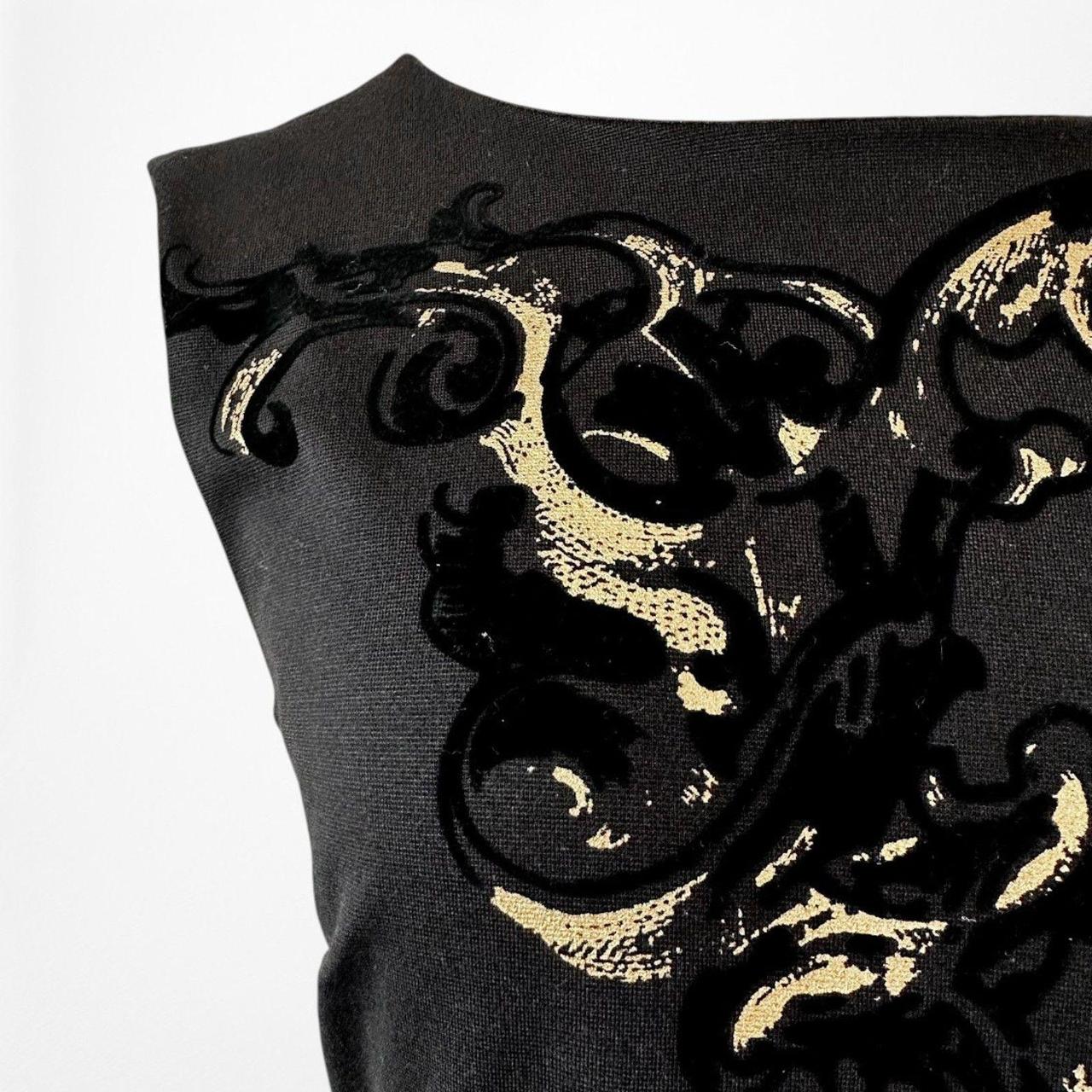 Vintage Y2K black bodycon knee length dress with baroque velvet scroll detailing and subtle shimmer, sleeveless boat neckline, fitted knit silhouette that hugs the waist and hips, knee length with back zip closure, perfect for 2000s glam, mob wife, dark coquette, going out, holiday party, or classy night out vibes.