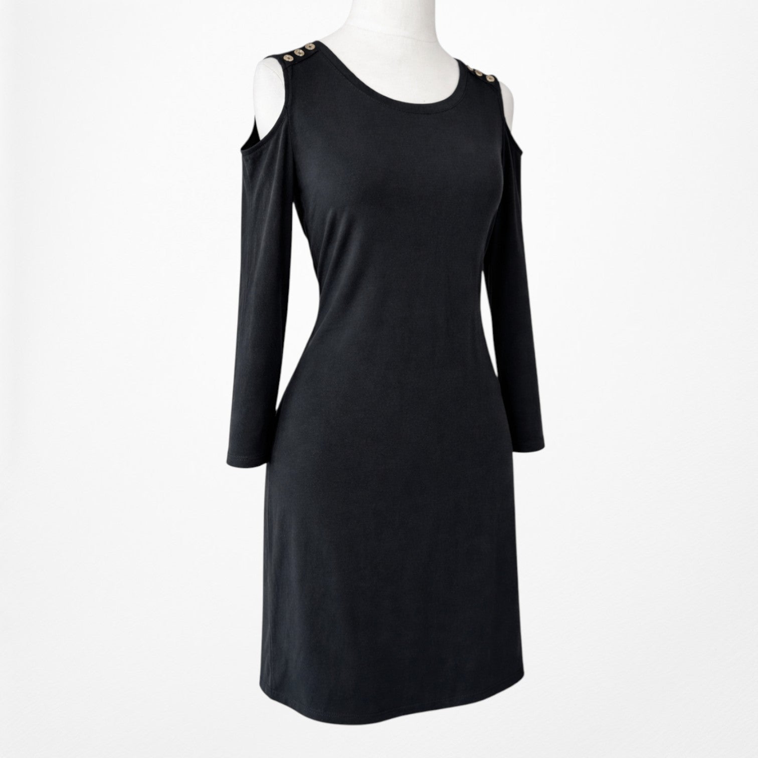 Y2K Black Knit Cold Shoulder Dress — sleek fitted pullover with quarter sleeves, shoulder cut-outs, and gold button accents. Knee-length bodycon silhouette in soft stretch knit. Minimal, club-ready, perfect for night out or layering.