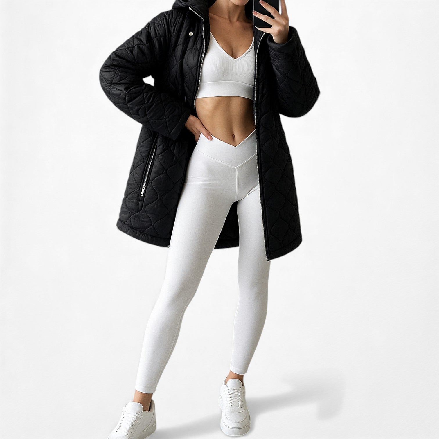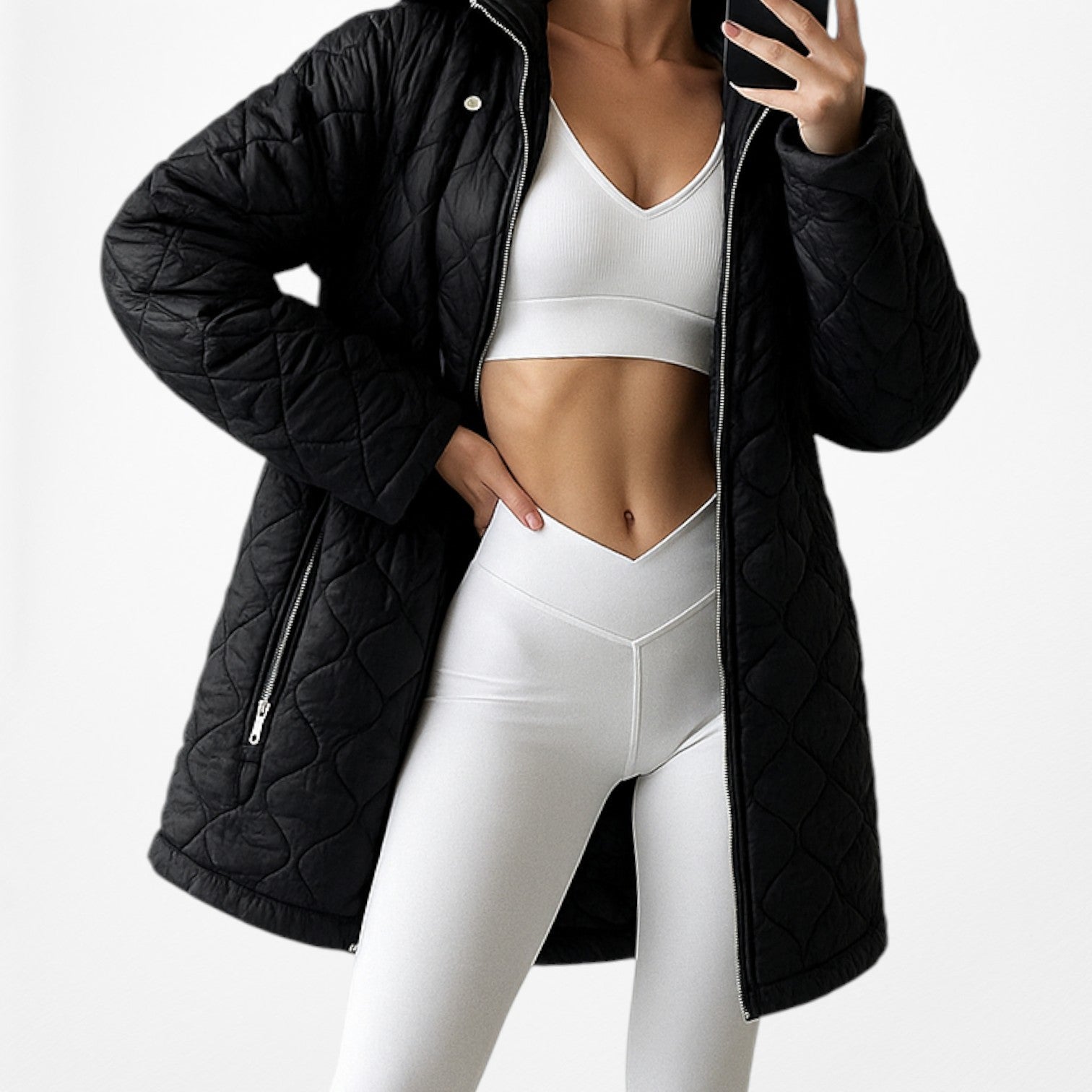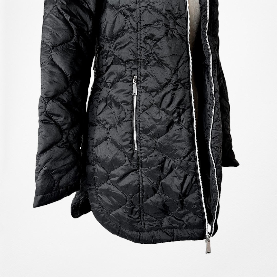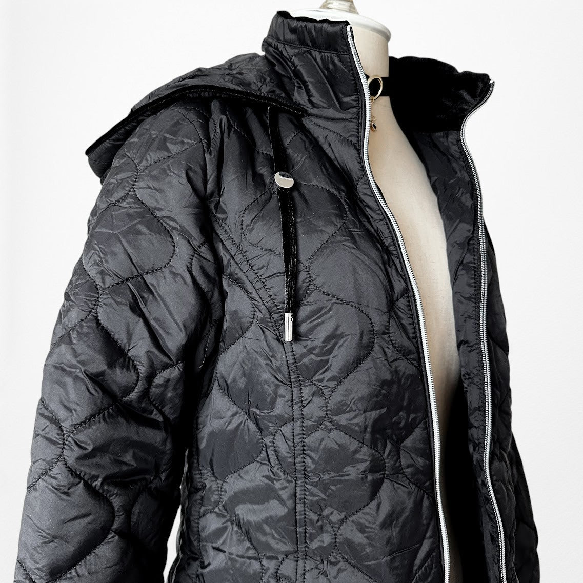 Oversized fit. Attached hoodie. Two front pockets. Front zip closure