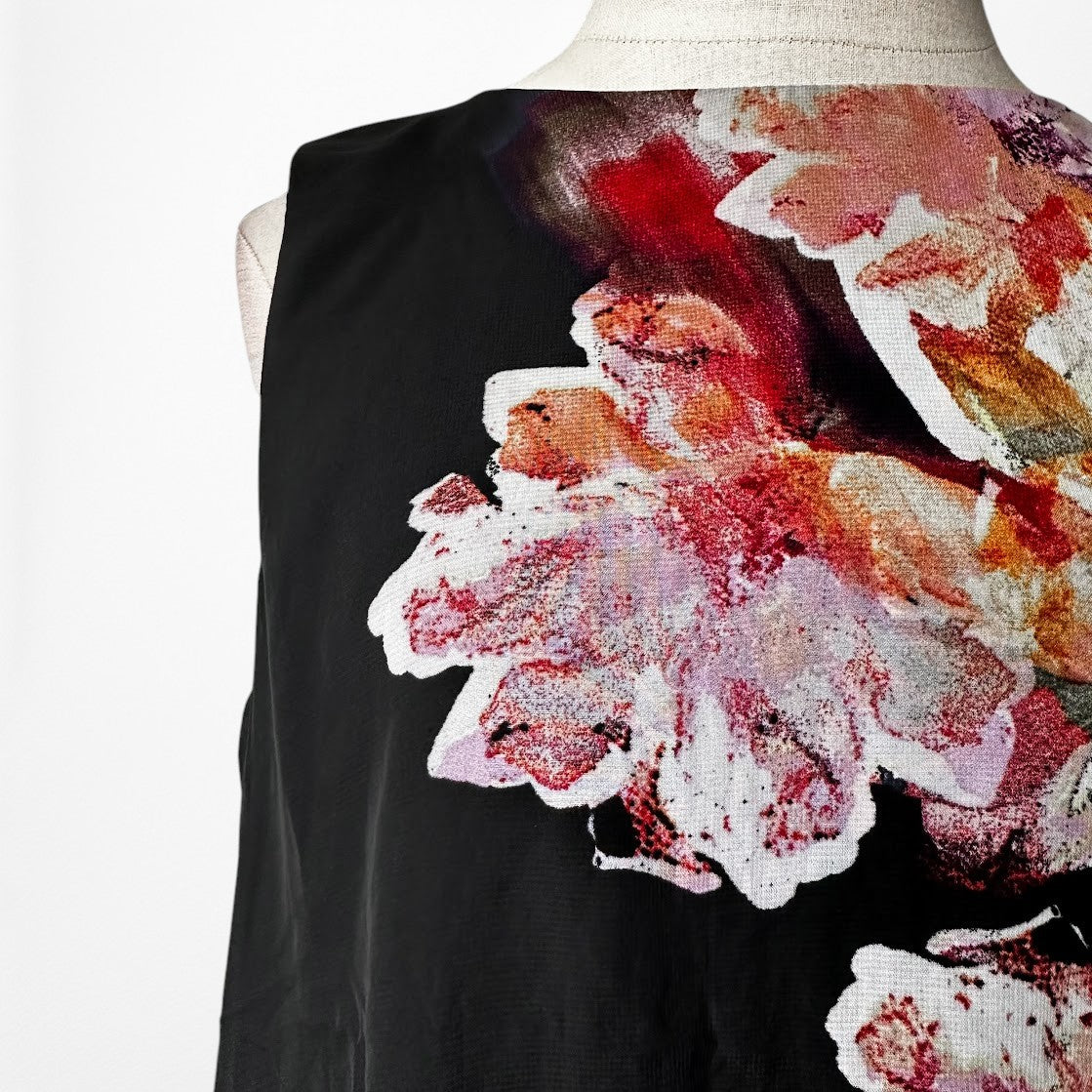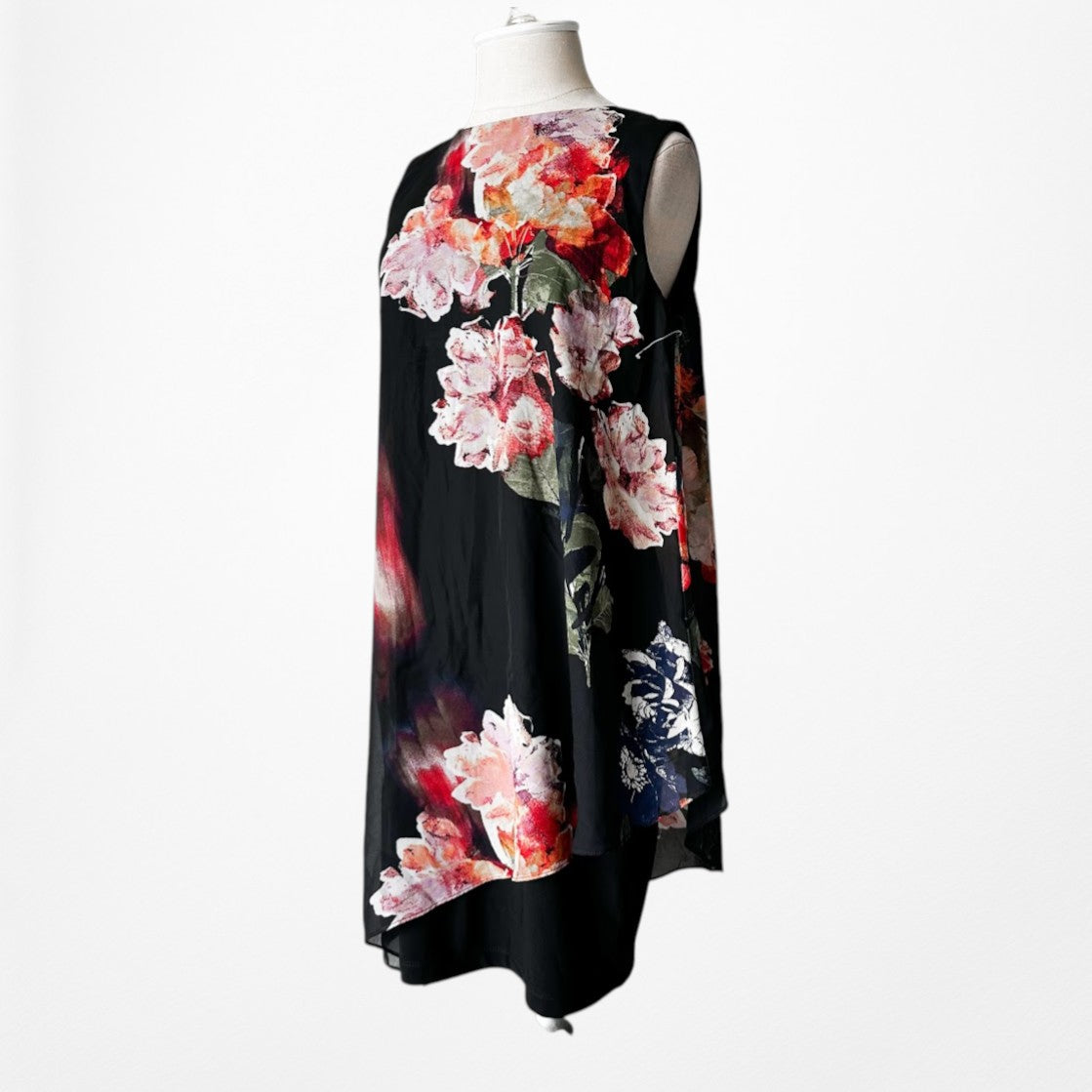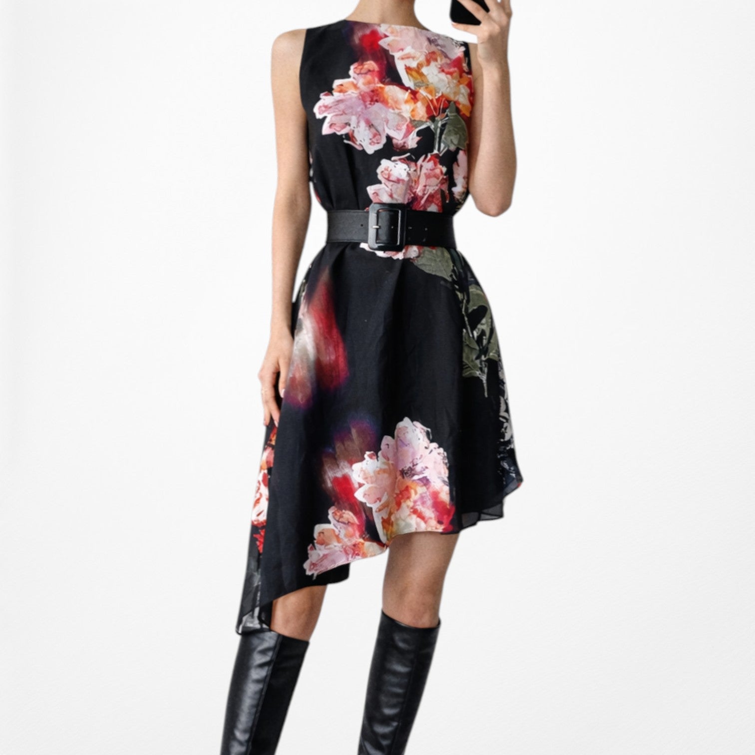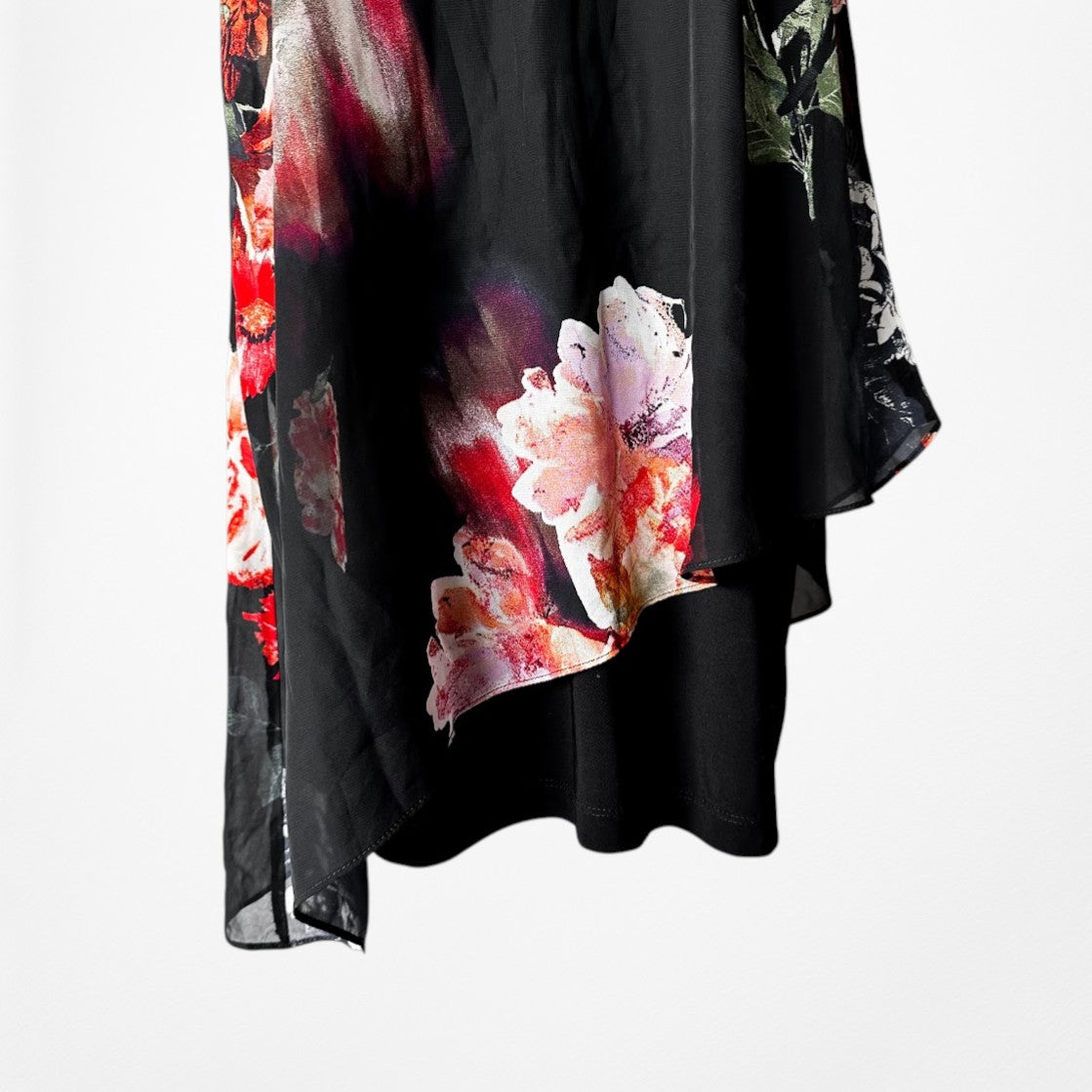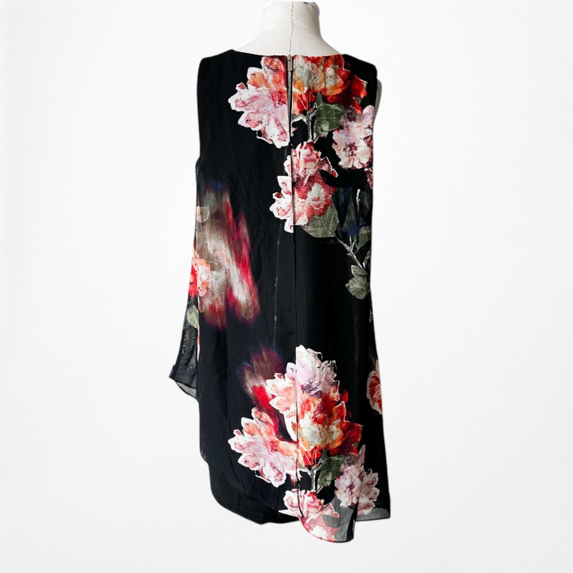 Vintage Y2K black floral chiffon knee length dress with asymmetrical hem, sleeveless silhouette, flowy layered overlay, back zip closure, and soft romantic rose print—perfect for dark coquette, indie sleaze, night out, wedding guest, or elevated everyday styling with boots or heels. Belt not included
