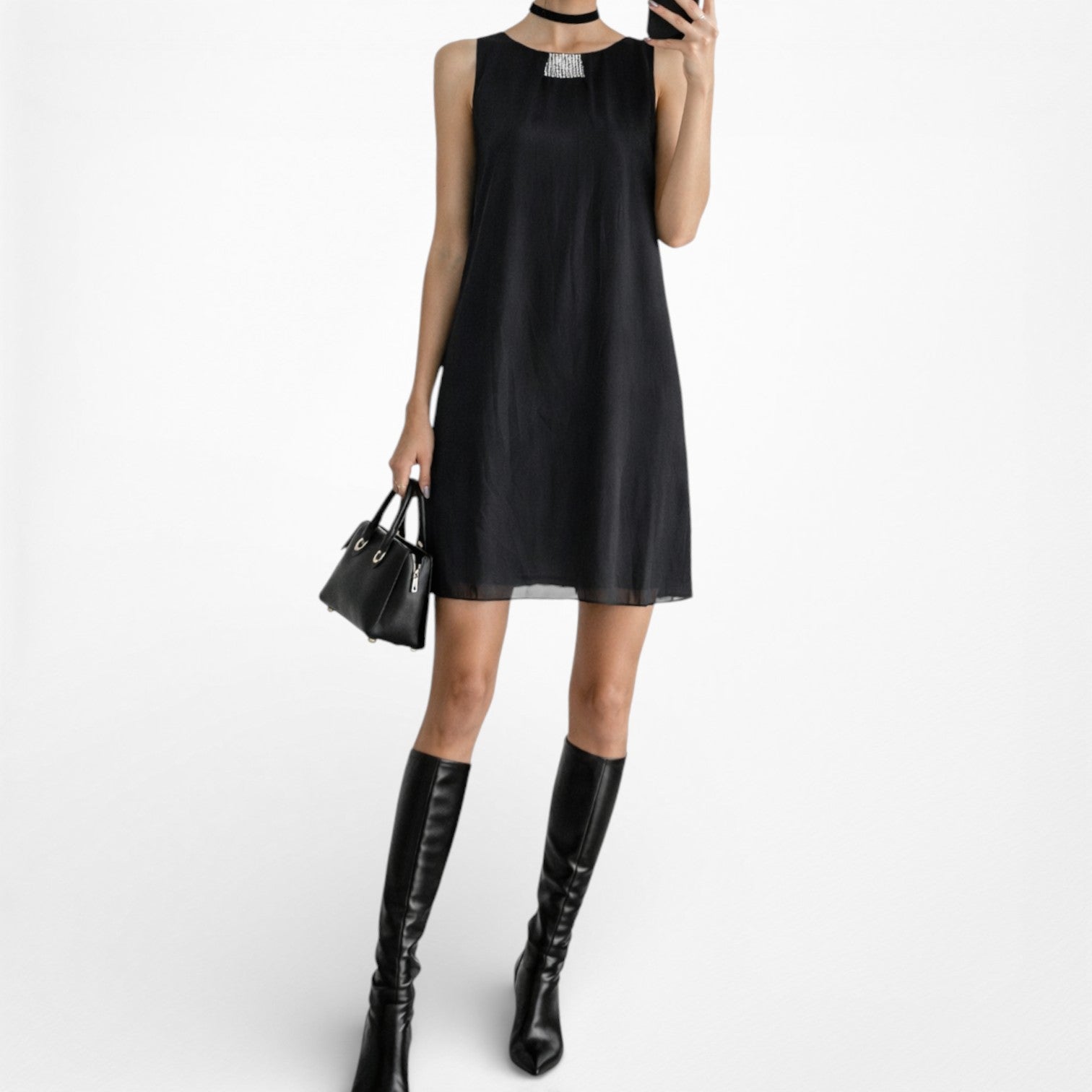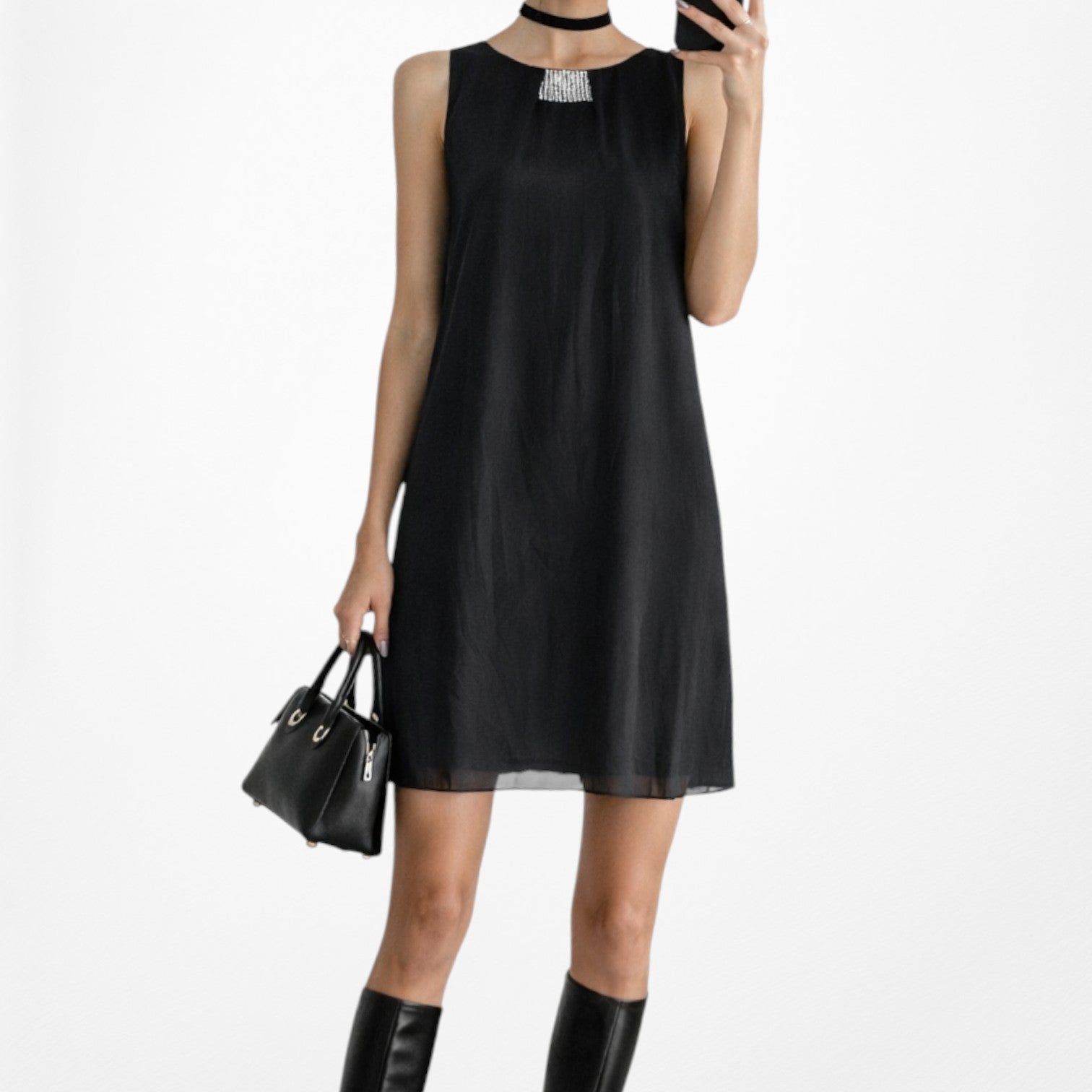 Vintage Y2K Black Sleeveless Rhinestone Pleated Knee Length Shift Dress Size M