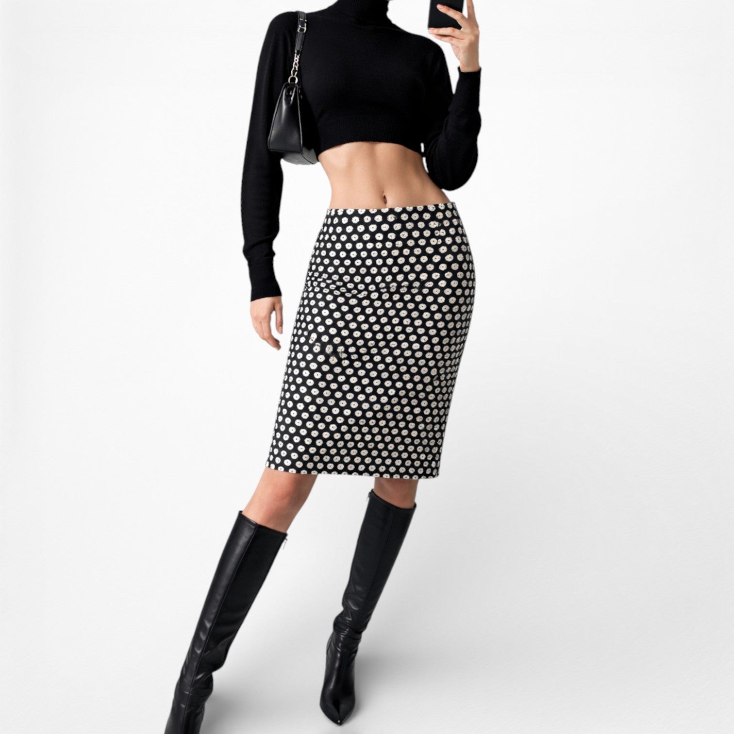 Black white polka dot geometric print. Knee length. Pencil straight bodycon style. Back zip closure. Wear it high waisted or low rise
