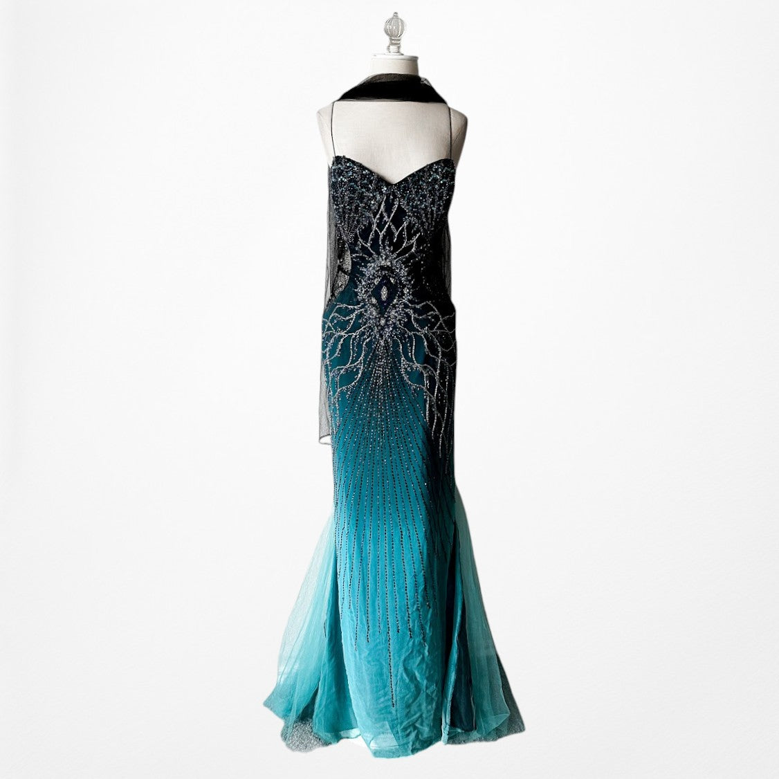 Y2K 2000s coquette fairy blue ombre maxi fit flared dress. Beaded throughout. Mesh cutouts on side bodice. Back zip closure. Sweetheart neckline. Spaghetti straps. Padded. Small train. Comes with shawl/scarf