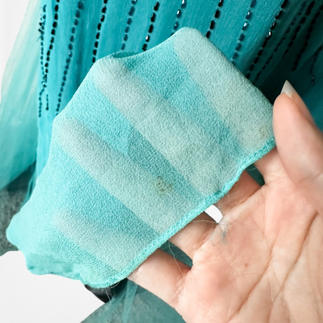 Pre-loved. Excellent. Some loose threads/missing beads. Minor stains and small tear near hem (not very noticeable)