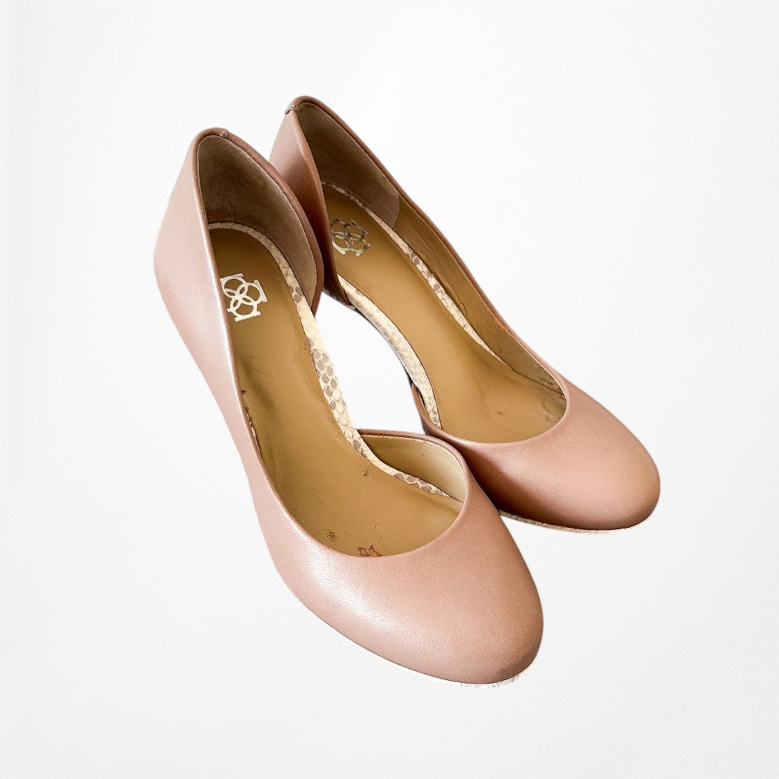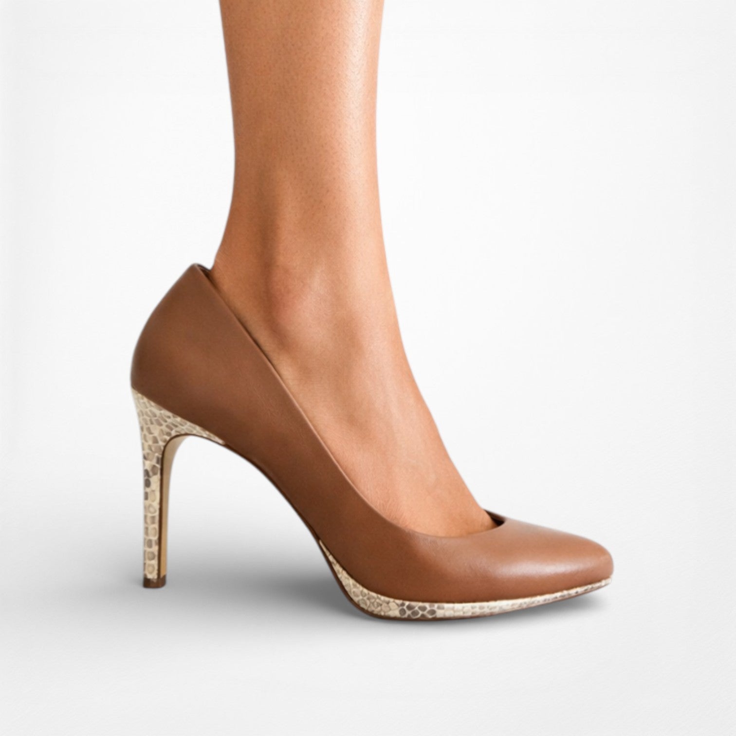 Vintage Y2K faux leather pumps in a warm brown tone with a sleek round toe and statement snakeskin-effect stiletto heel, giving major early-2000s office siren and night-out energy; classic slip-on silhouette with a polished finish that pairs perfectly with mini skirts, midi dresses, or low-rise trousers, ideal for Y2K, coquette, soft glam, or vintage chic looks.