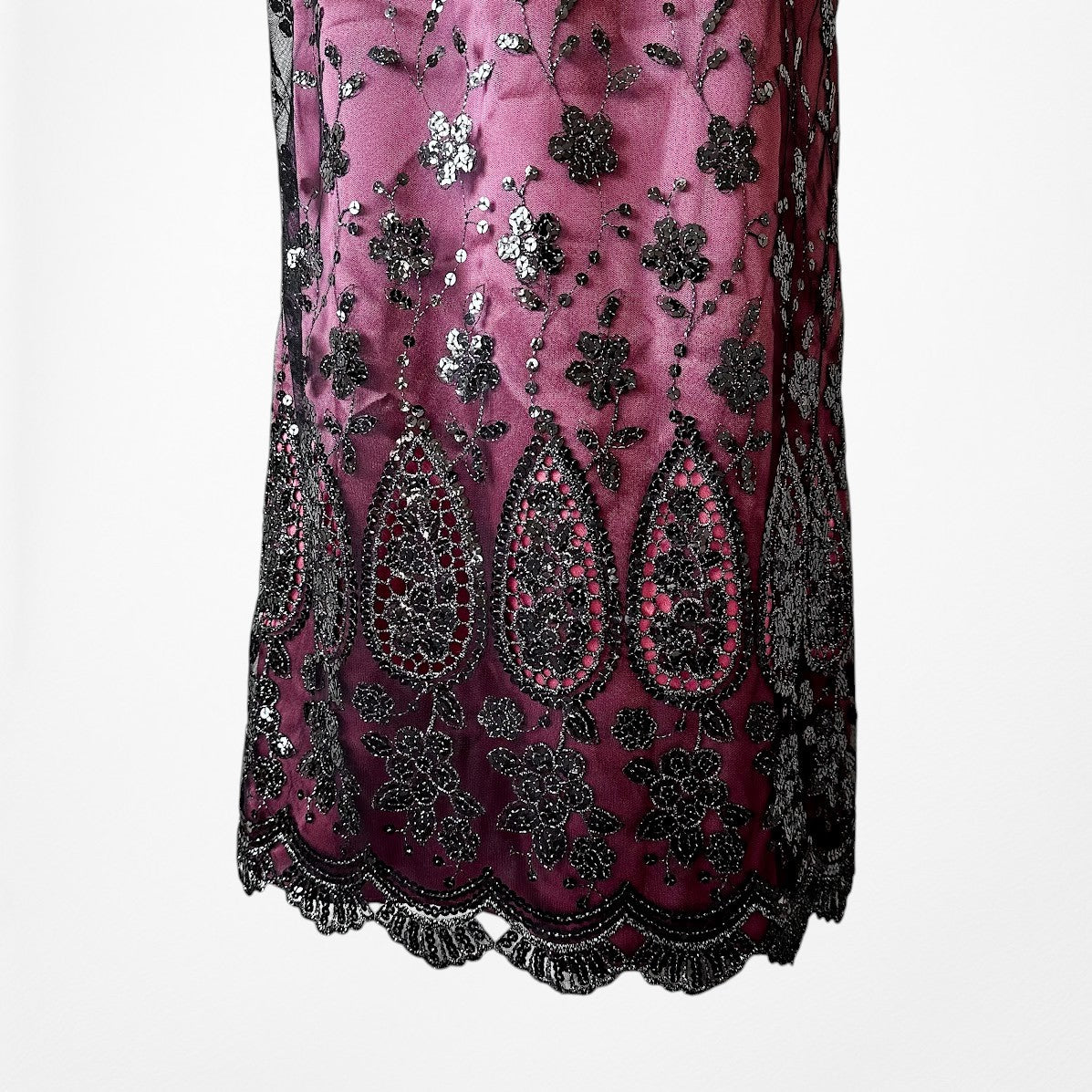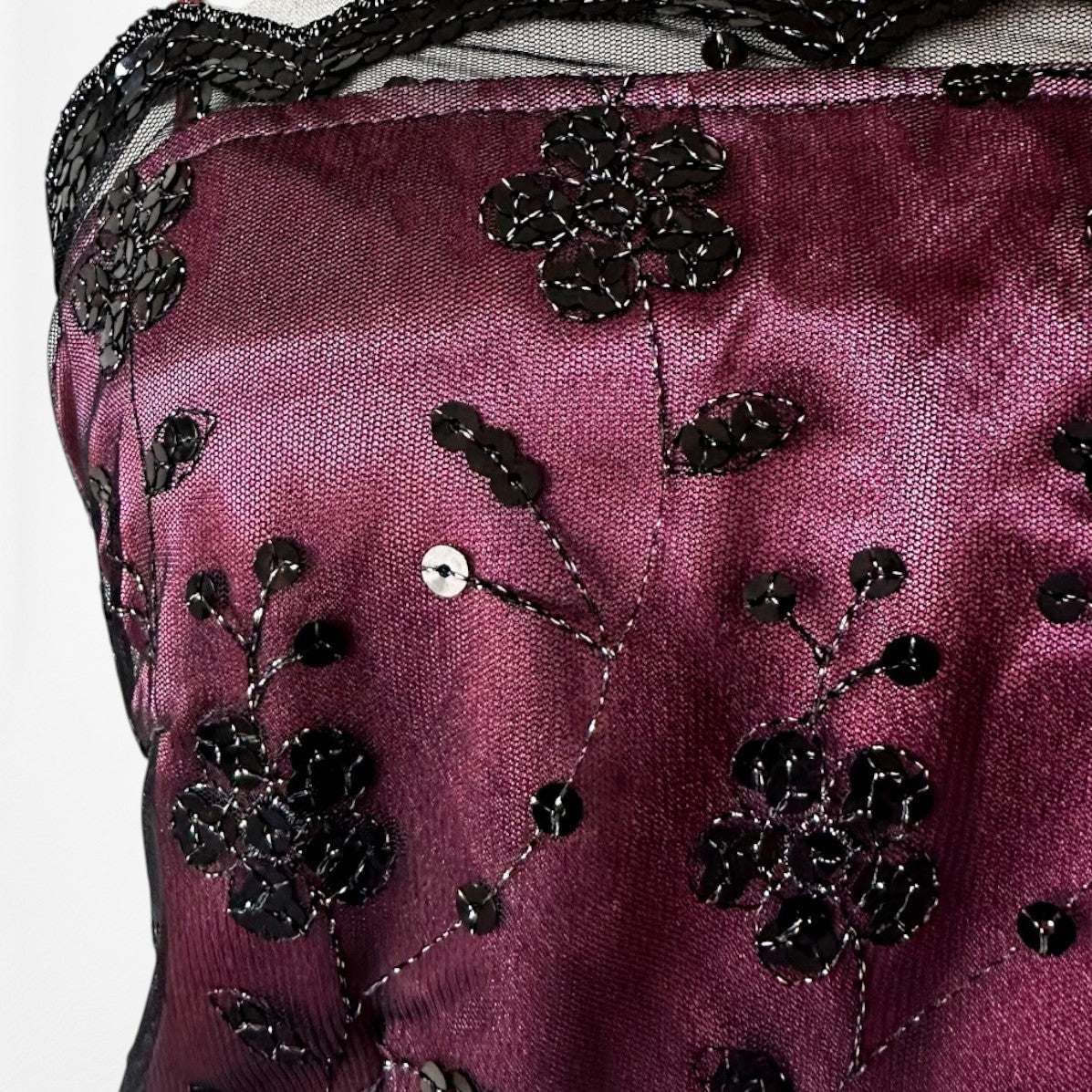 Y2K 2000s fairy burgundy red bodycon maxi dress. Square neckline. Spaghetti straps. Floral beaded throughotu over a mesh fabric. Scallop trim. Satin lining. Side zip closure