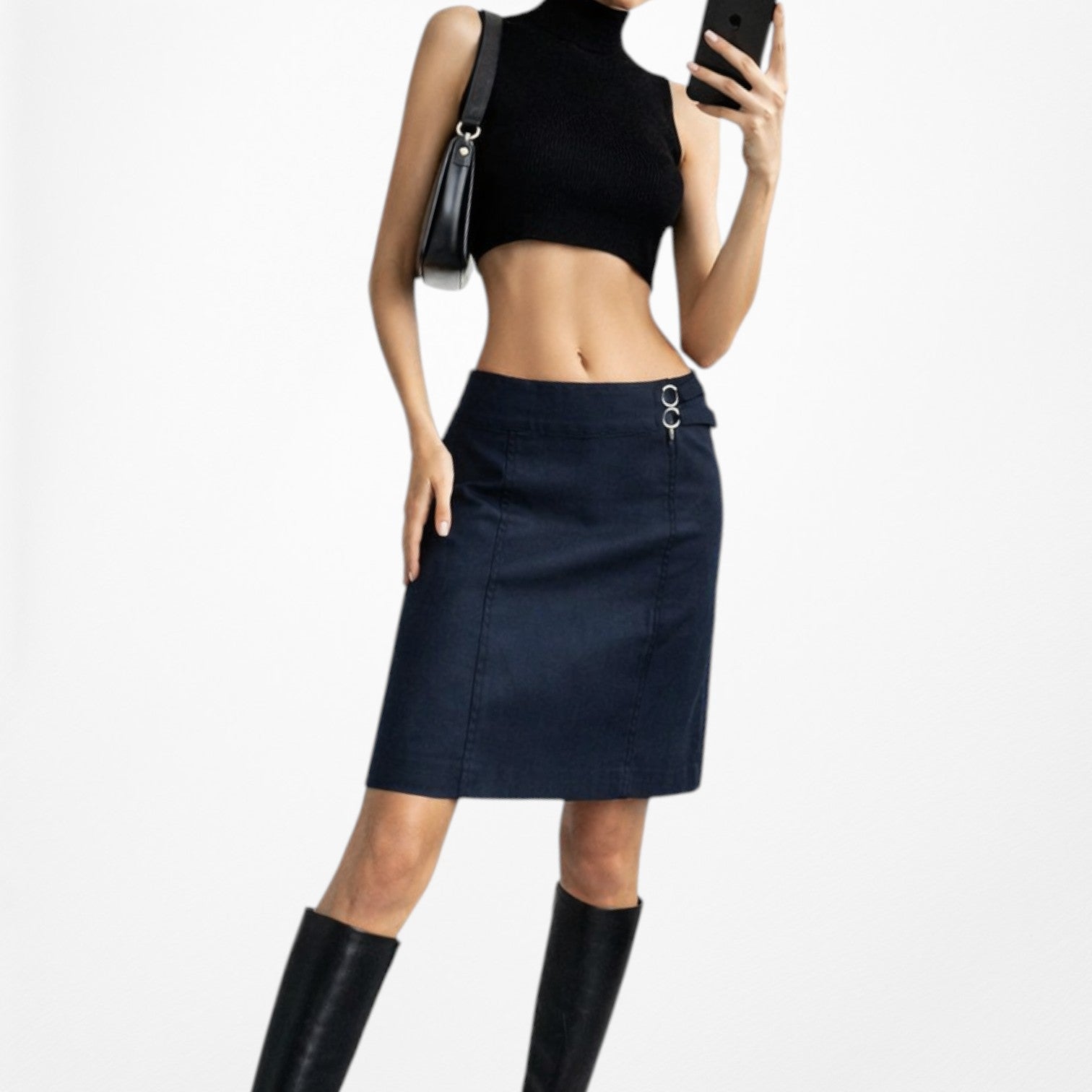 A navy blue knee length skirt. A-Line flared style. Back zip closure. Side buckle detail. Denim look