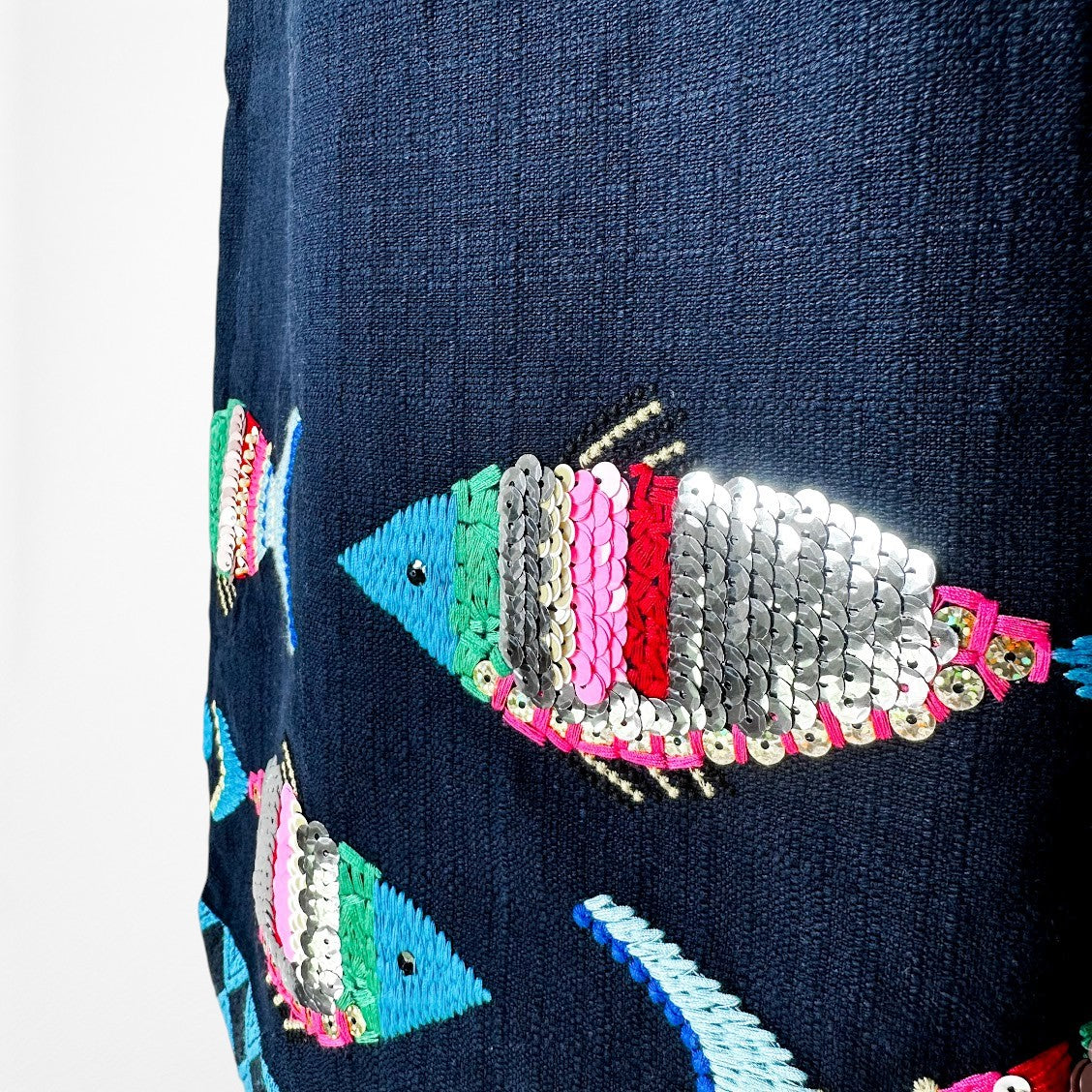 Sleeveless. Knee length. Tropical fish sequin embellishments on hem. Shift dress. Side zip closure