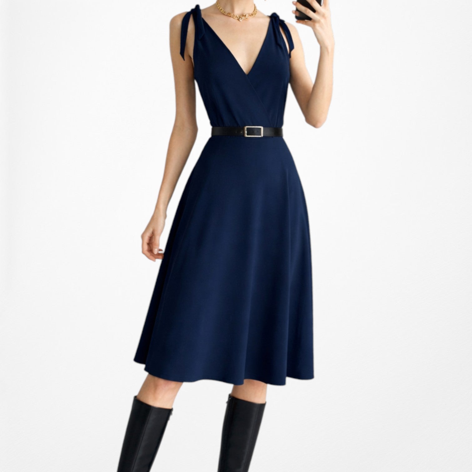 Vintage Y2K navy blue knee-length pullover dress with a flowy A-line skirt, wrap-style V neckline, tie shoulder straps, and minimalist slip silhouette perfect for effortless 2000s chic, casual nights out, or modern office-to-evening styling.