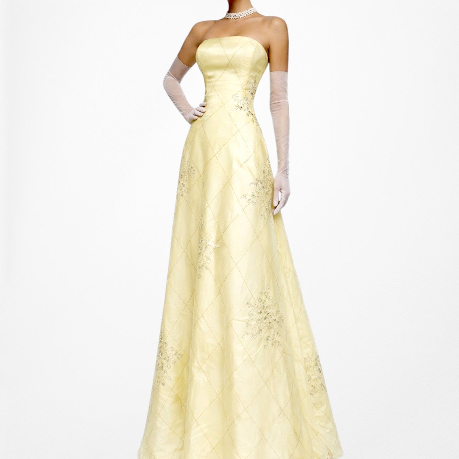 Vintage prom dress in pale yellow with a strapless neckline and delicate embroidered detailing over a subtle diamond pattern, featuring a sleek fitted bodice and a soft flowy silhouette with tulle lining for added volume, finished with a zip closure in the back and giving a 90s Y2K minimalist fairycore aesthetic perfect for formal or spring events.