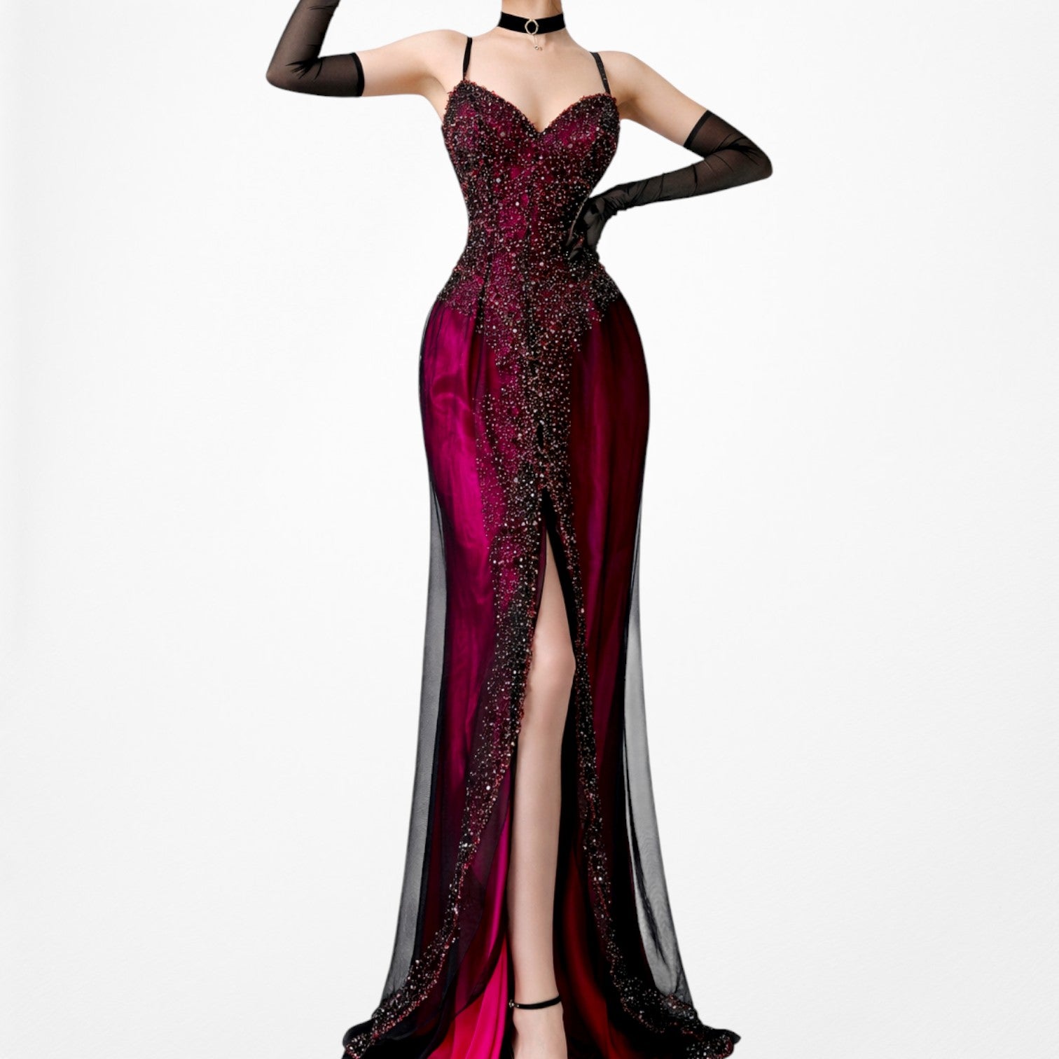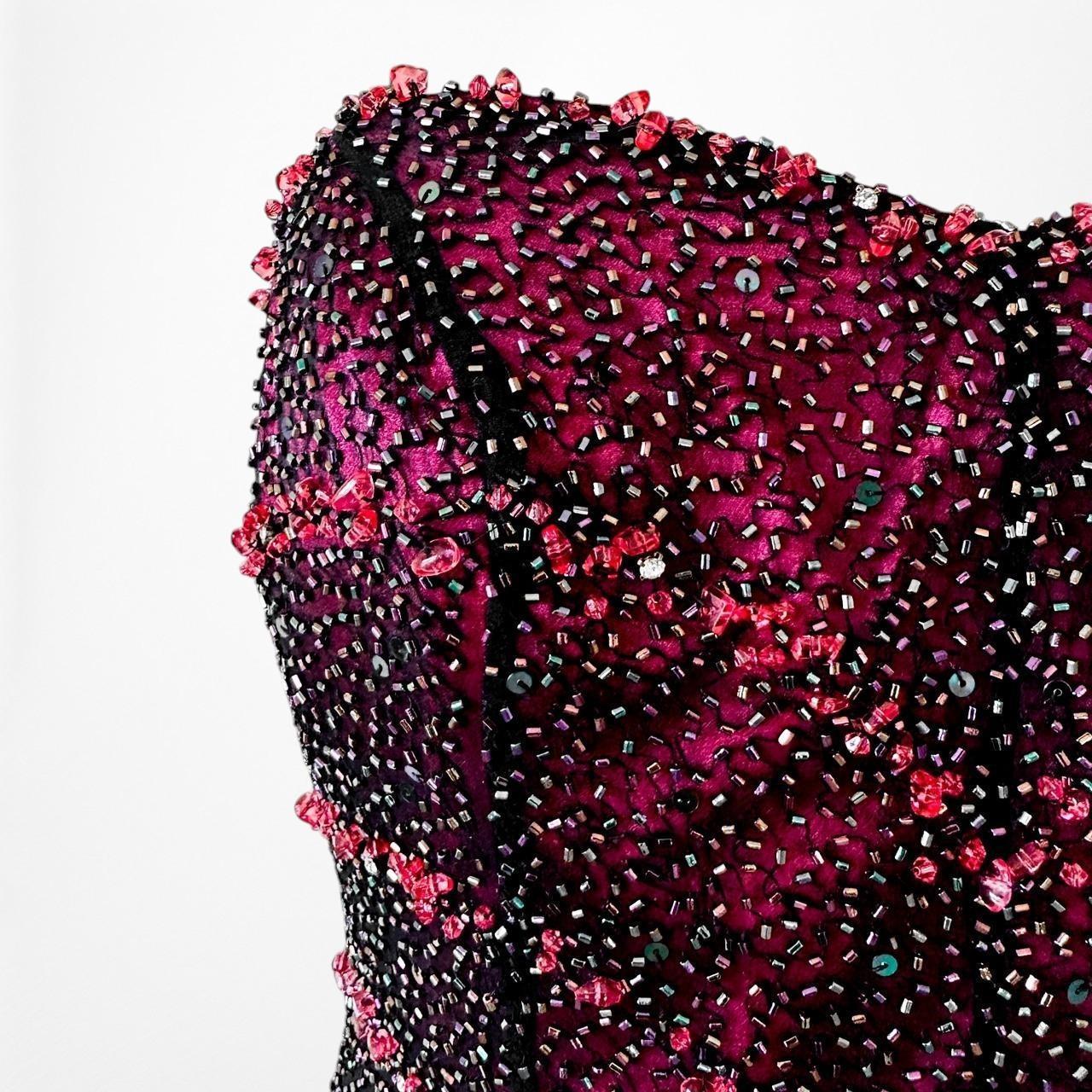 Y2K 2000s coquette fairy burgundy red maxi fit flared dress. Sweetheart neckline. Spaghetti straps. Asymmetric front hem with slit. Back zip closure. Beaded throughout over a mesh fabric. Padded