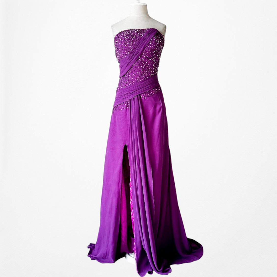 Vintage Y2K Purple Strapless Beaded Side Slit Fit Flared Maxi Prom Dress Size S